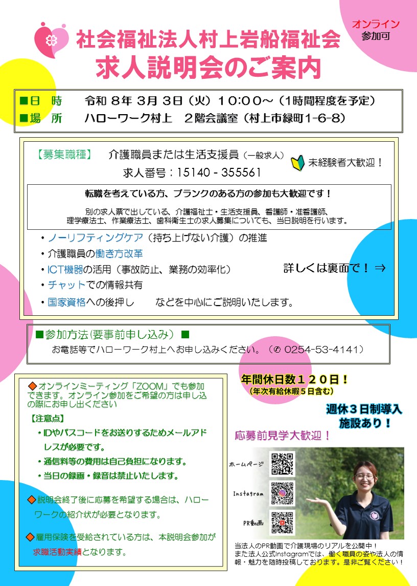 社会福祉法人村上岩船福祉会求人説明会を開催します。