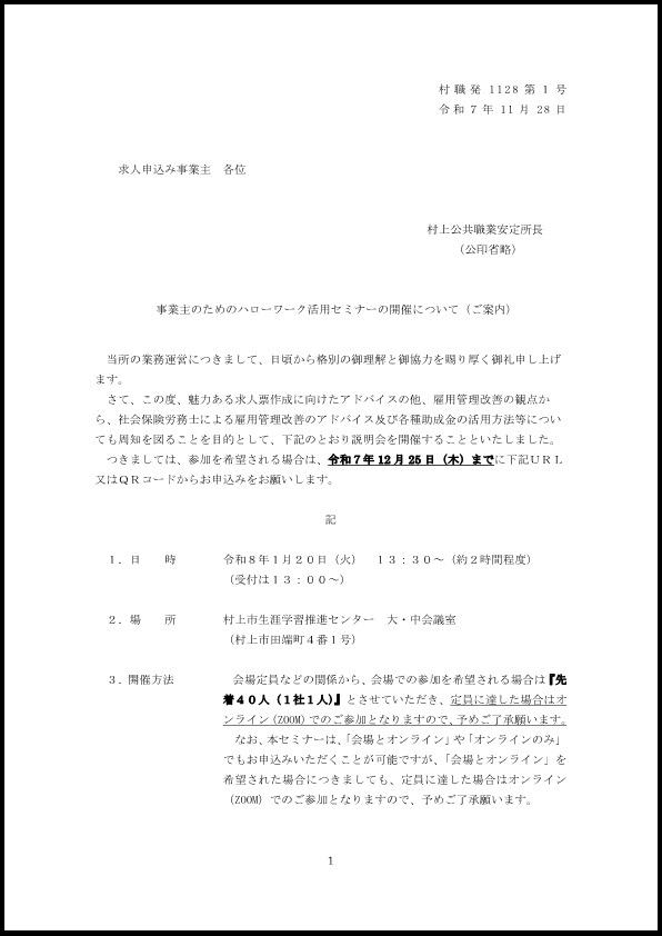 さて、この度、魅力ある求人票作成に向けたアドバイスの他、雇用管理改善の観点から、社会保険労務士による雇用管理改善のアドバイス及び各種助成金の活用方法等についても周知を図ることを目的として説明会を開催することといたしました。
