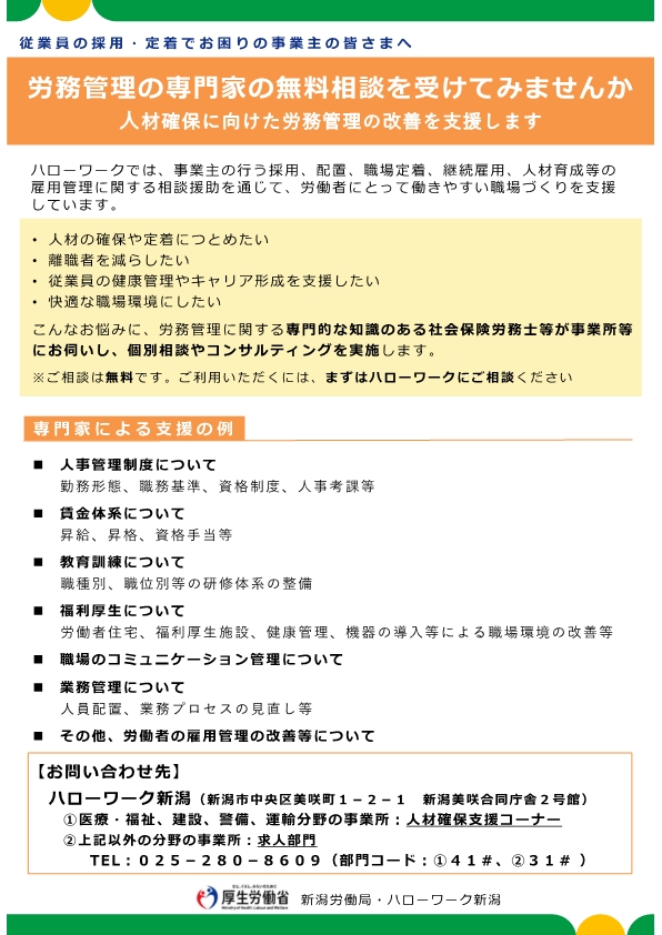 ハローワーク新潟では、事業主の行う採用、配置、職場定着、継続雇用、人材育成等の雇用管理に関する相談援助を通じて、労働者にとって働きやすい職場づくりを支援しています。