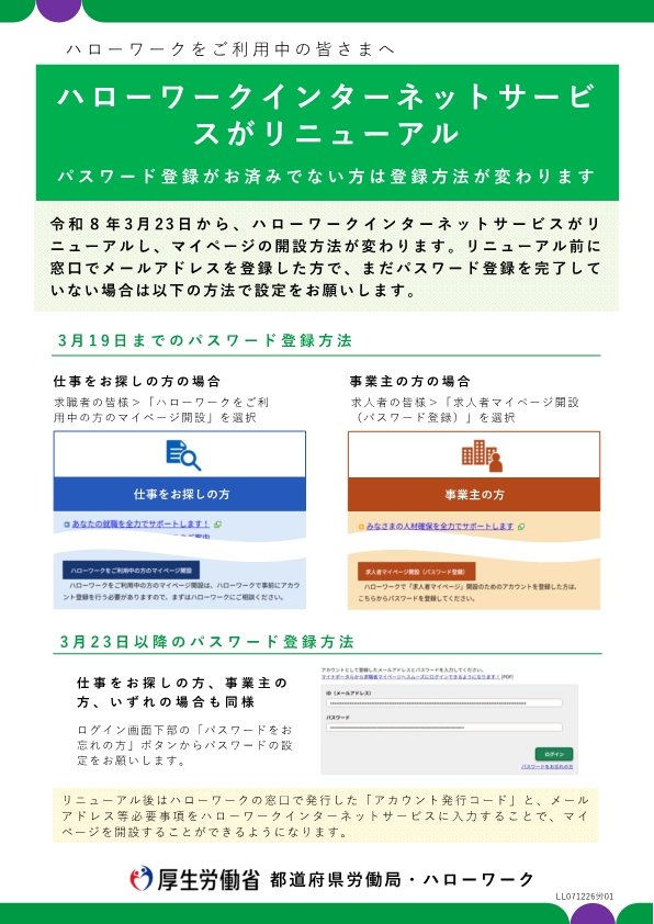 ハローワークインターネットサービスをリニューアルいたします。