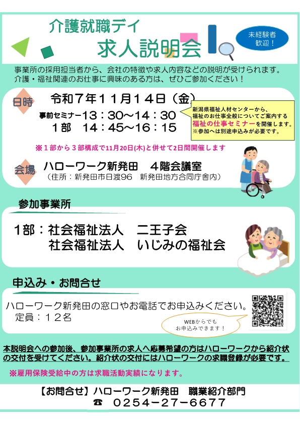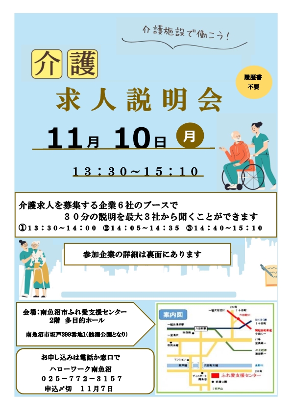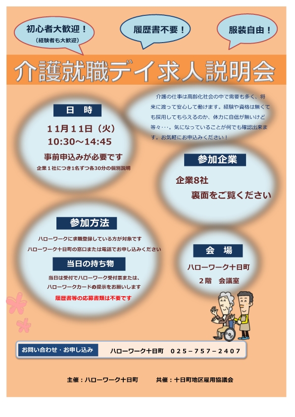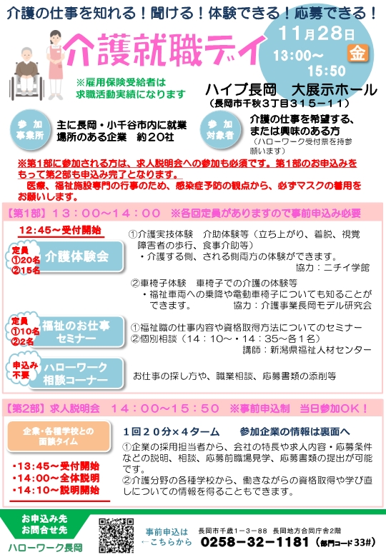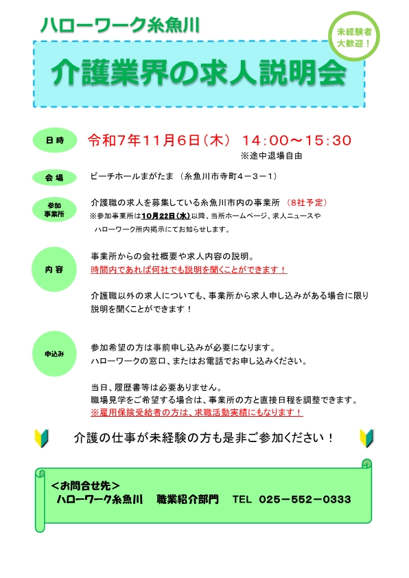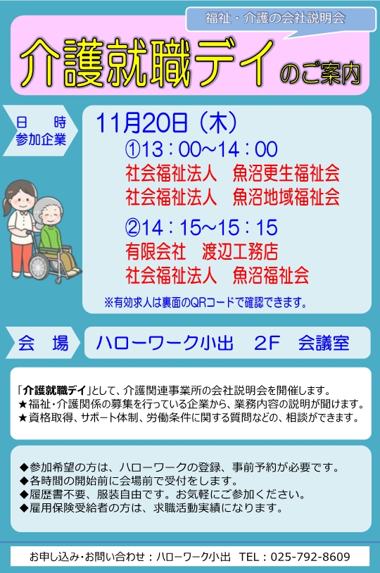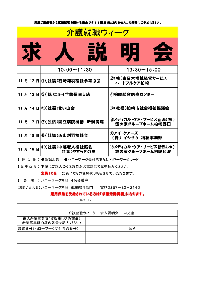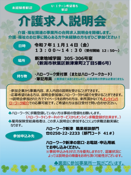 新潟県内の各ハ ローワークでも求人申込みをしている介護関係事業所と介護分野への就職を希望している求職者との求人説明会を実施します。