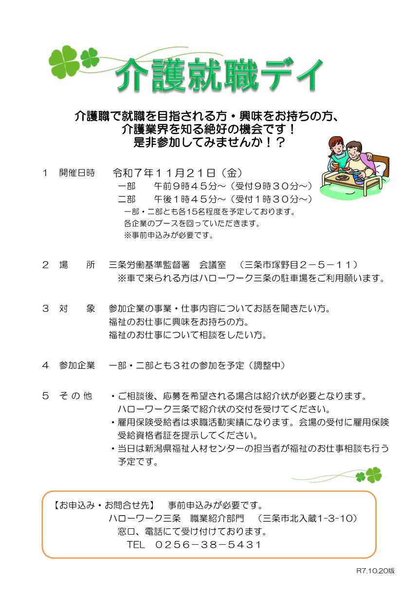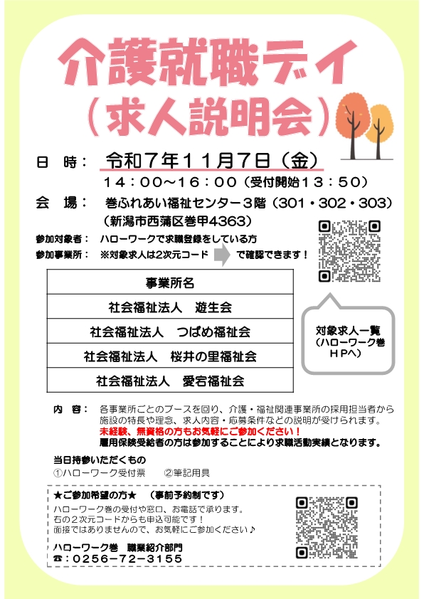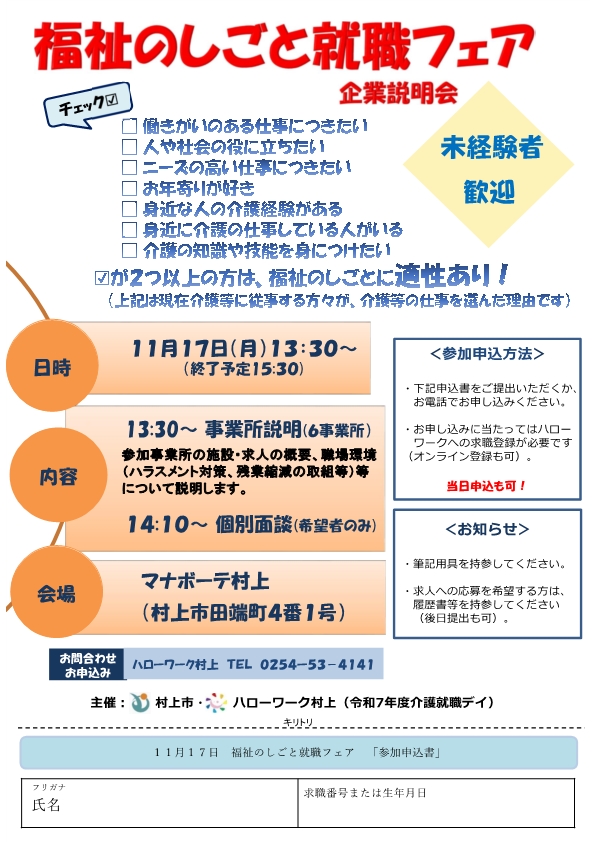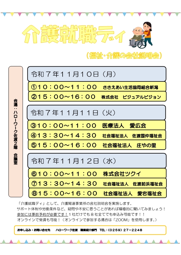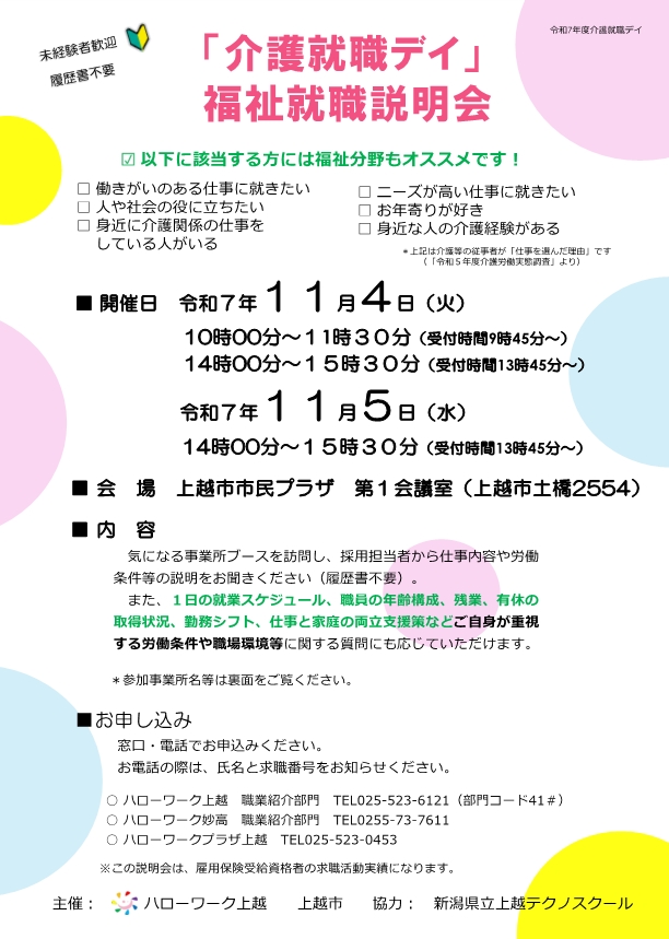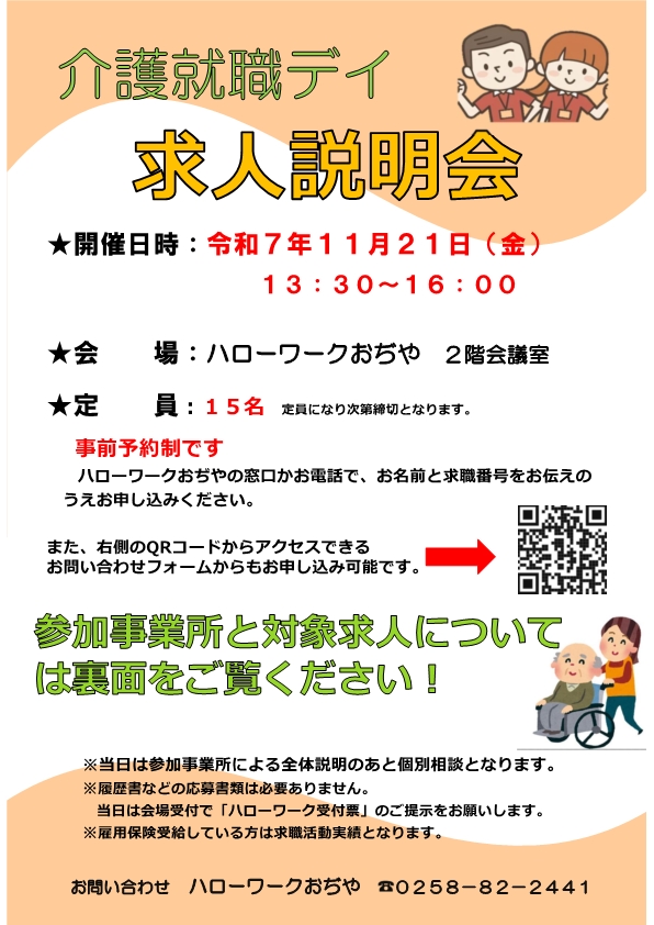 新潟県内の各ハ ローワークでも求人申込みをしている介護関係事業所と介護分野への就職を希望している求職者との求人説明会を実施します。