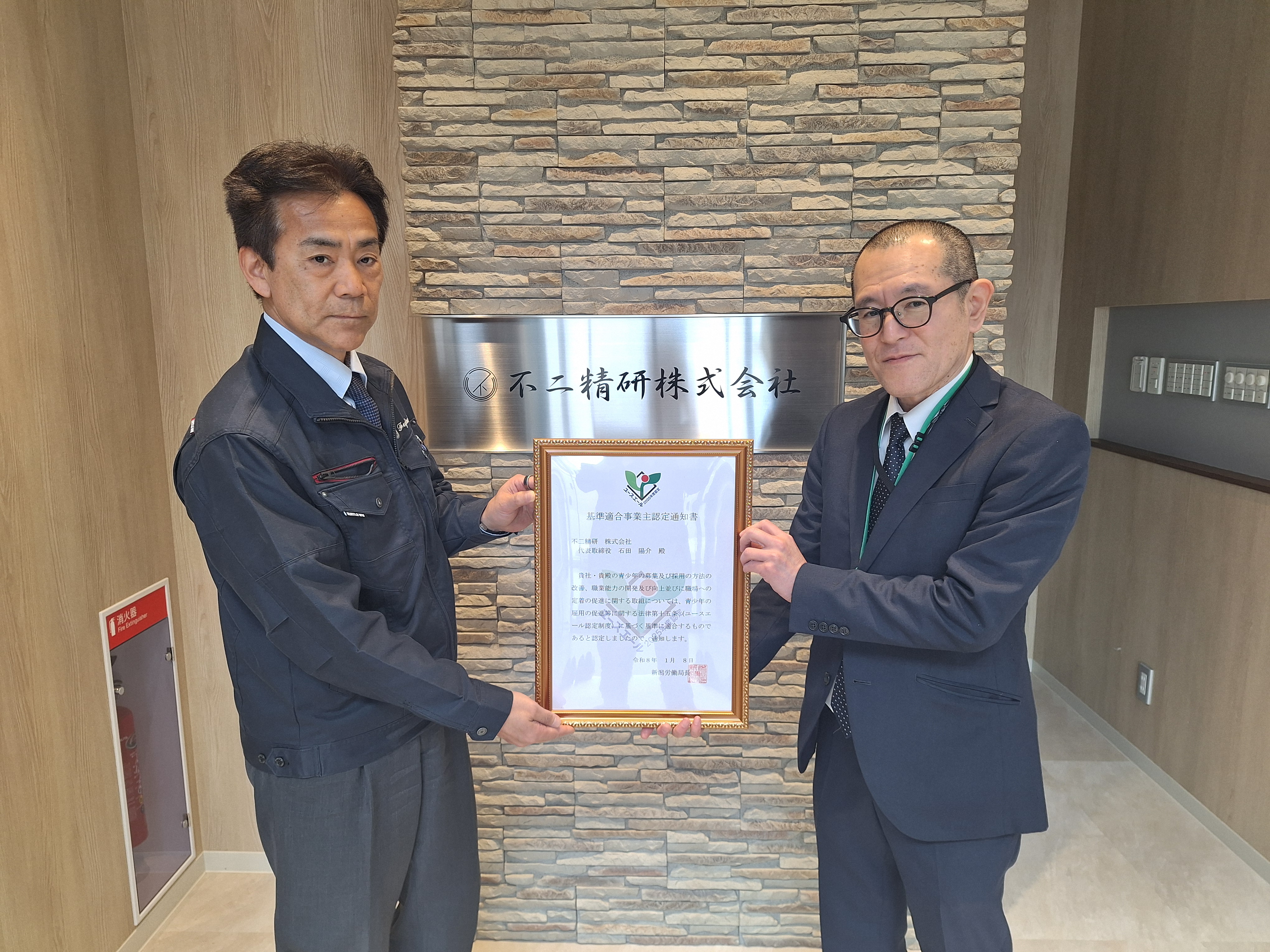 この度、ユースエール認定企業として上越市の「不二精研究株式会社」が認定され、認定証を交付しました。