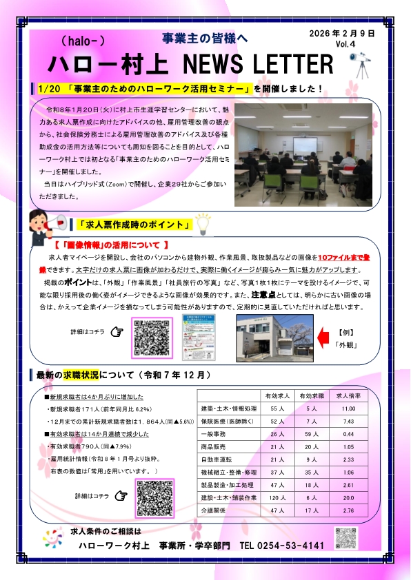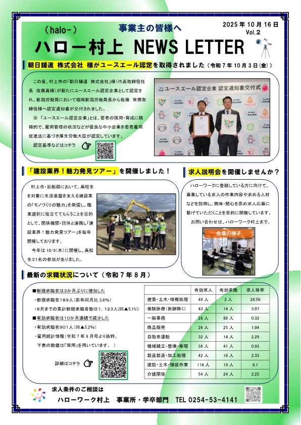 ハローワーク村上では、ハローワーク村上管内の事業主様へお役立ち情報をお届けするため、令和7年7月から、「ハロー(halo-)村上 NEWS LETTER」を発行しております。
