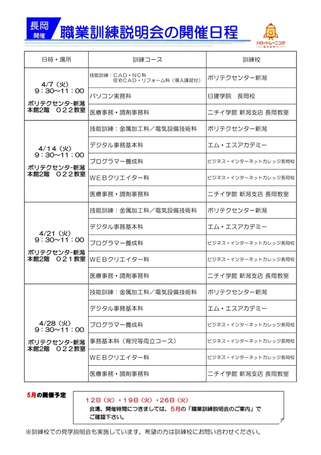 ⇒上記「職業訓練説明会のご案内」をご確認ください。 -