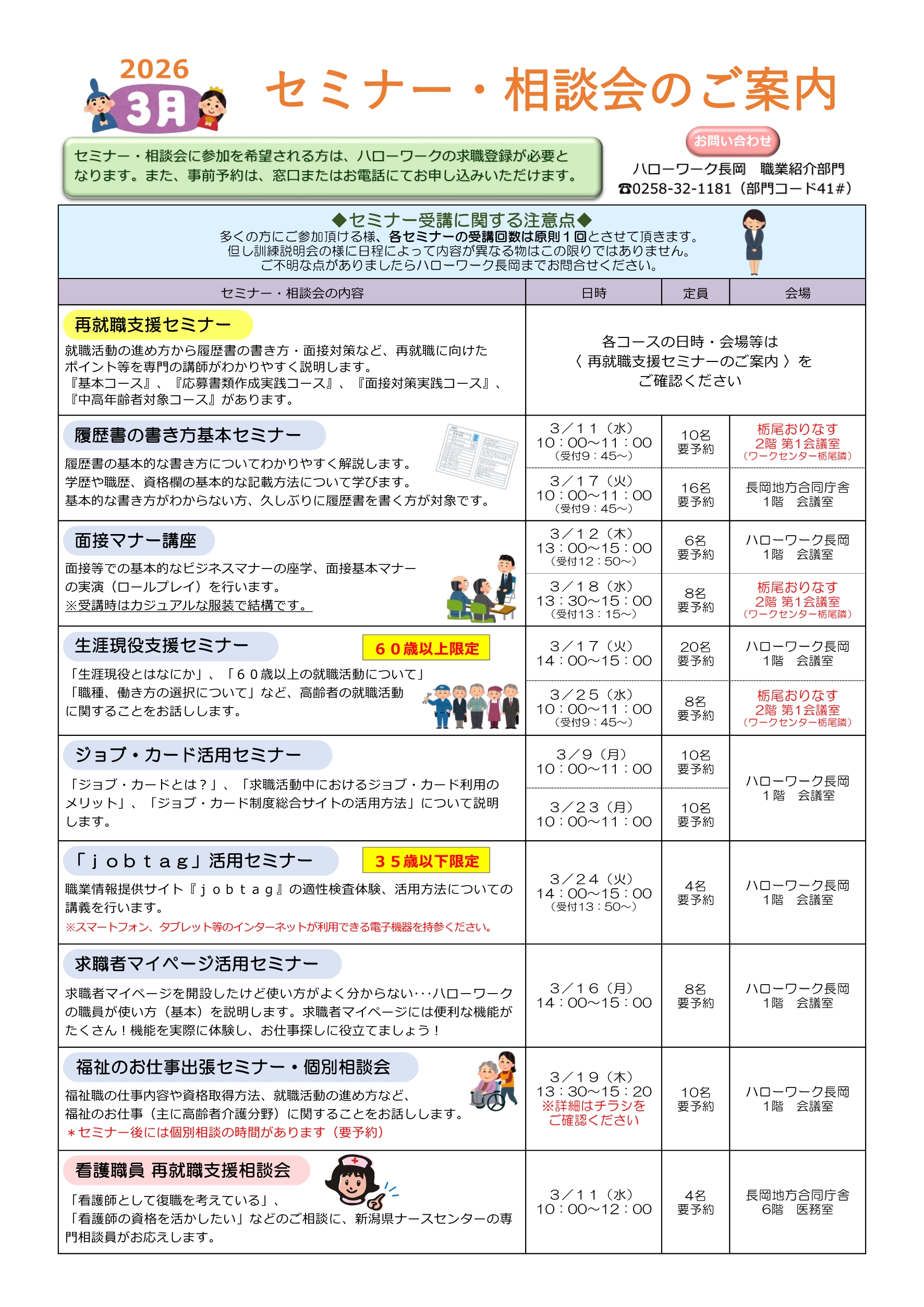 がん、肝炎、糖尿病等の疾病で治療中・通院中の方の支援窓口です。専門の就職支援担当者「就職支援ナビゲーター」が、あなたの能力や適性、病状、治療状況などを考慮し、就職を支援します。ハローワーク長岡 専門援助部門 0258-32-1181(42#)