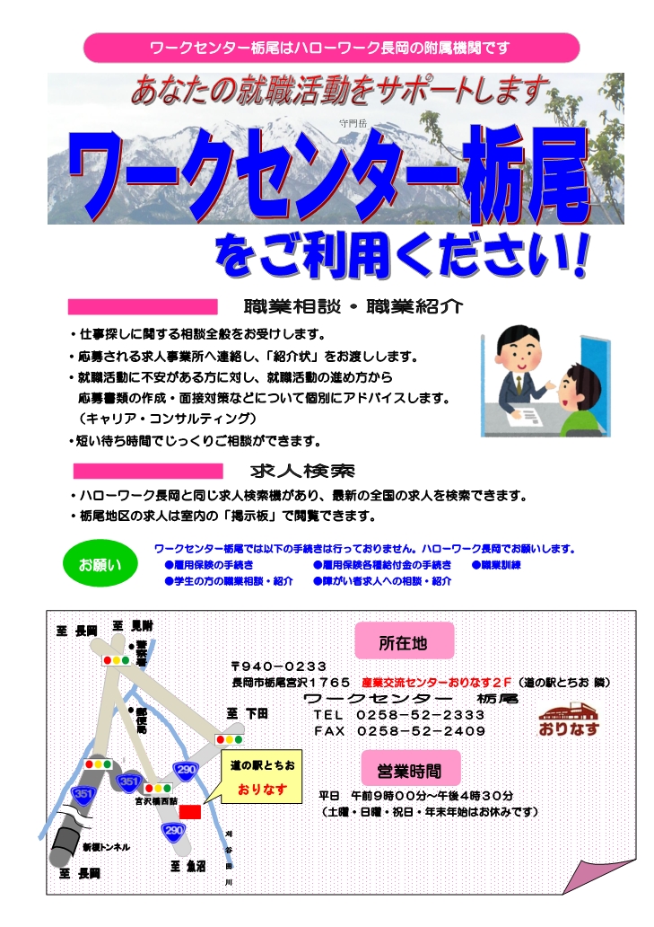 ワークセンター栃尾は、仕事をお探しの方にハローワーク長岡と同じ職業紹介サービスを提供しています。