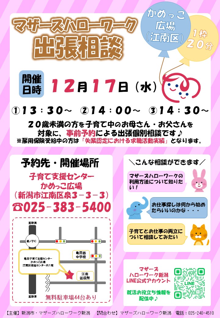 | 住所 | 新潟市中央区弁天2-2-18 新潟 KS ビル1F ときめきしごと館内 マザーズハローワーク新潟 TEL 025-240-4510 FAX 025-241-8610 |