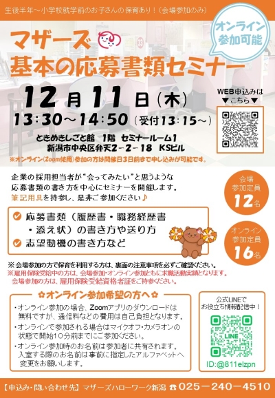 | 住所 | 新潟市中央区弁天2-2-18 新潟 KS ビル1F ときめきしごと館内 マザーズハローワーク新潟 TEL 025-240-4510 FAX 025-241-8610 |