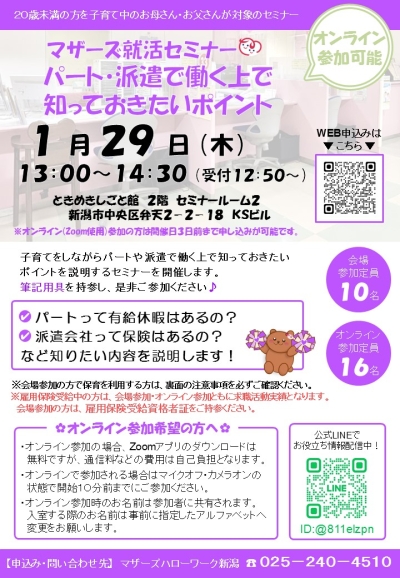 20歳未満のお子さまをお持ちのお母さん・お父さんでパートタイムや派遣の雇用形態で再就職を希望する方を対象にセミナーを開催します。
