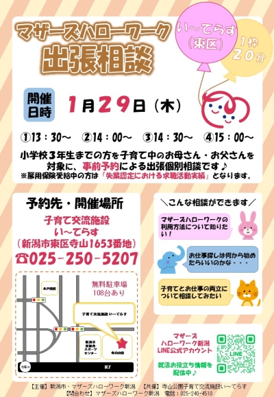 | 住所 | 新潟市東区寺山1653番地 子育て交流施設 い~てらす TEL 025-250-5207 |