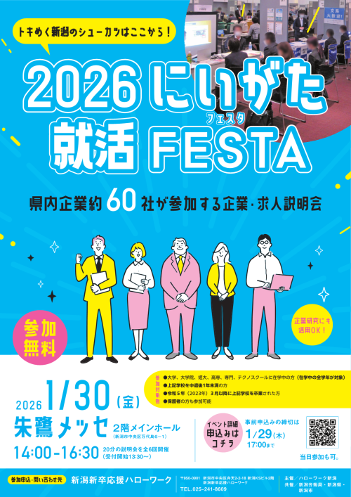 新潟新卒応援ハローワークでは、地元企業の人材確保と大学生等の就職を目的に「2026にいがた就活FESTA」を朱鷺メッセで開催しました。対面形式により実施し、企業は62社、学生等は48名にご参加いただきました。
