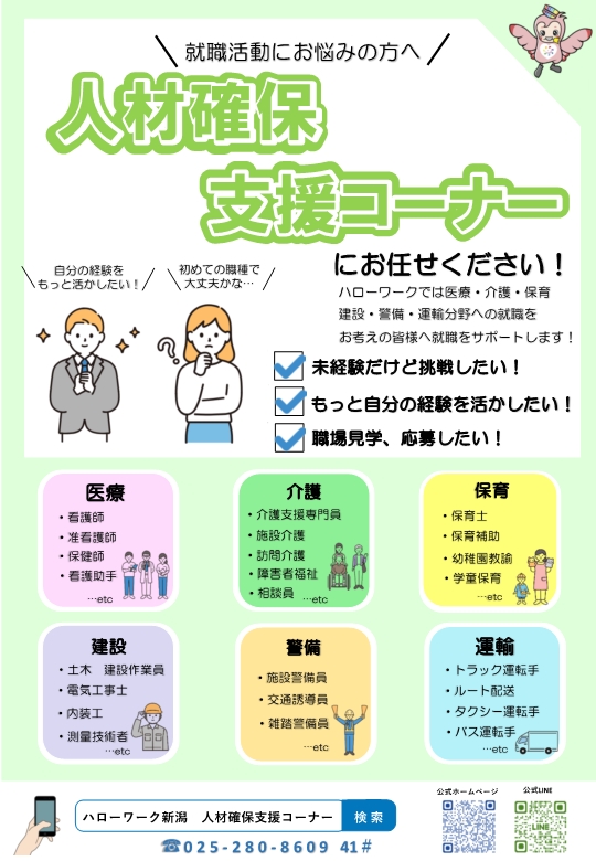 美咲町にありますハローワーク新潟の人材確保支援コーナーでは、医療・介護・保育・建設・警備・運輸分野への就職活動をサポートします。業界別のセミナーや求人説明会なども随時開催しています。
