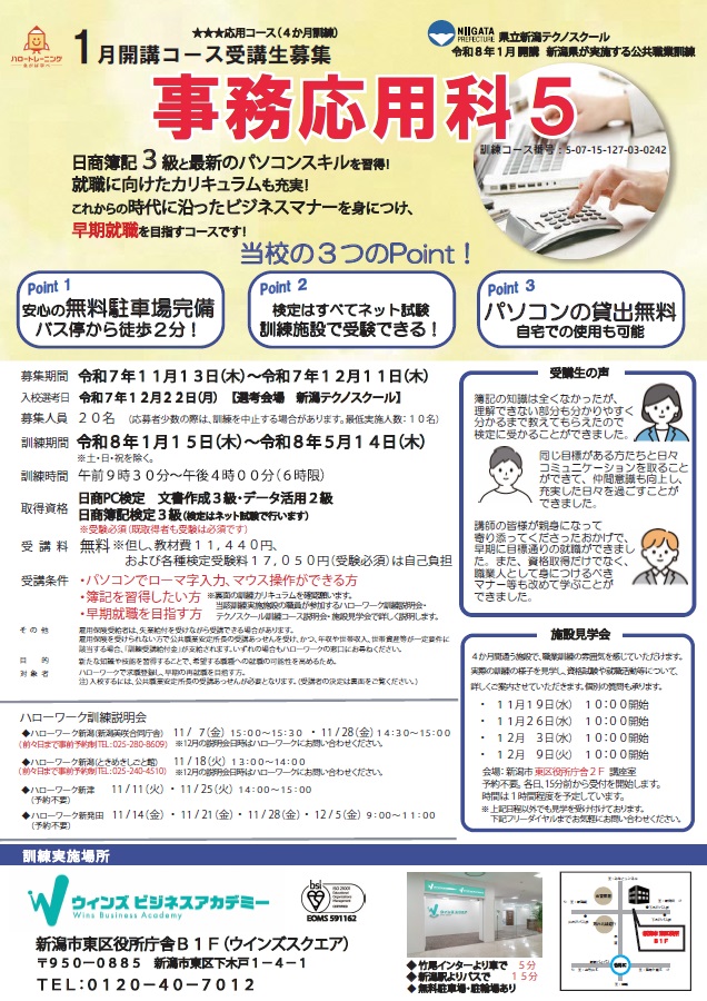 事前予約制で行いますので、参加ご希望の方はハローワーク新潟ときめきしごと館、またはハローワーク新潟の訓練担当までお問合せください。