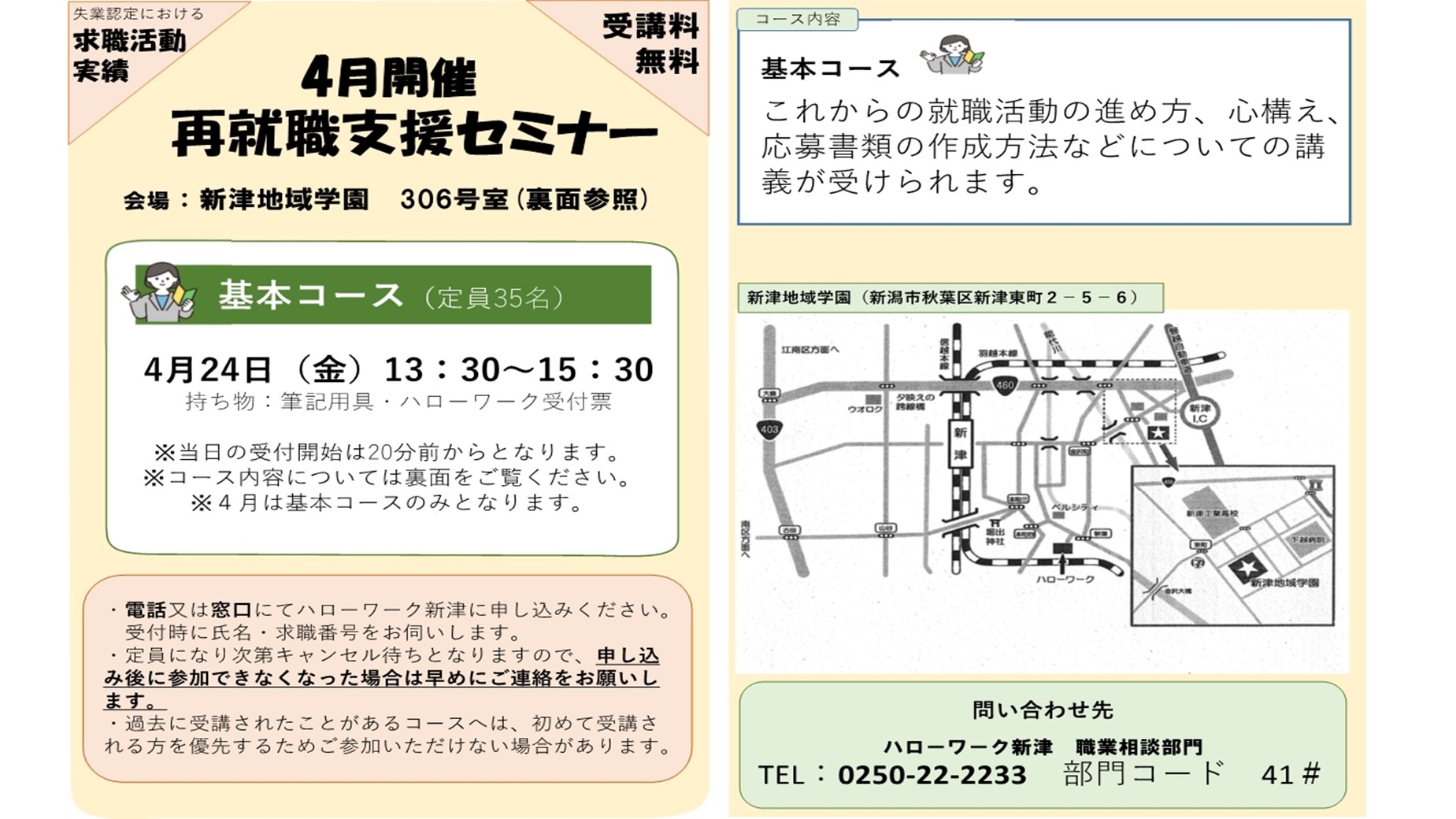 窓口や電話でお申込みください。 ハローワーク新津 職業紹介部門 TEL 0250-22-2233〔部門コード41#〕