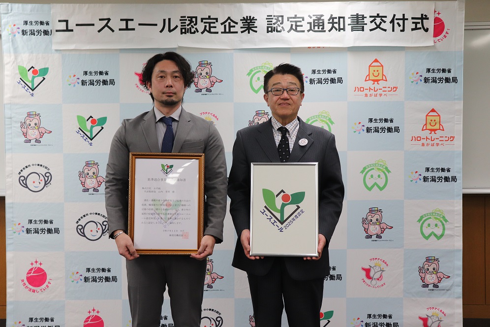 この度、新潟労働局にてユースエール等認定交付式が行われ、ハローワーク三条管内の「株式会社山内組様」が認定されました。