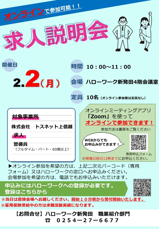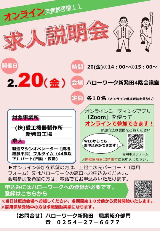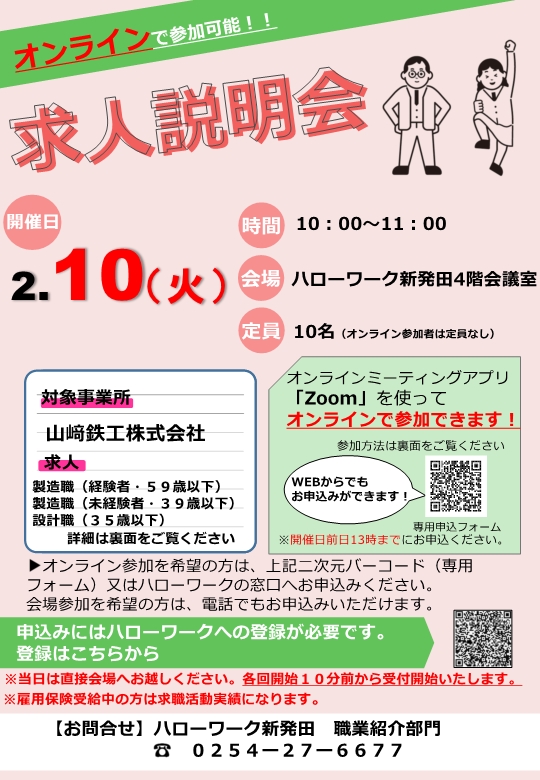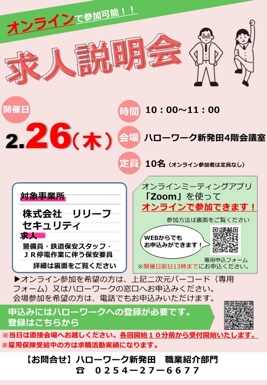 なお、上記の時間を過ぎてお申込みされる場合は、ハローワーク新発田(0254-27-6677)までご連絡ください。