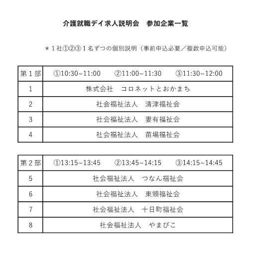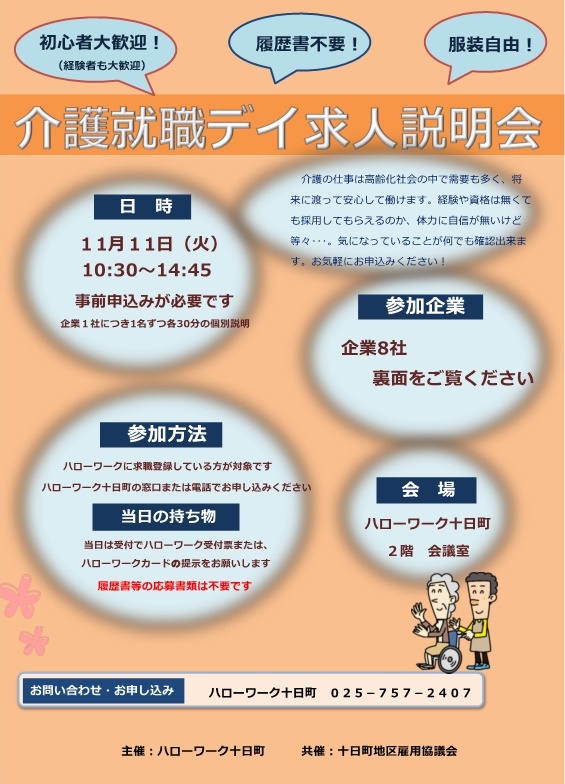 十日町市、津南町の介護の求人についての説明を個別で聞くことができる説明会です。