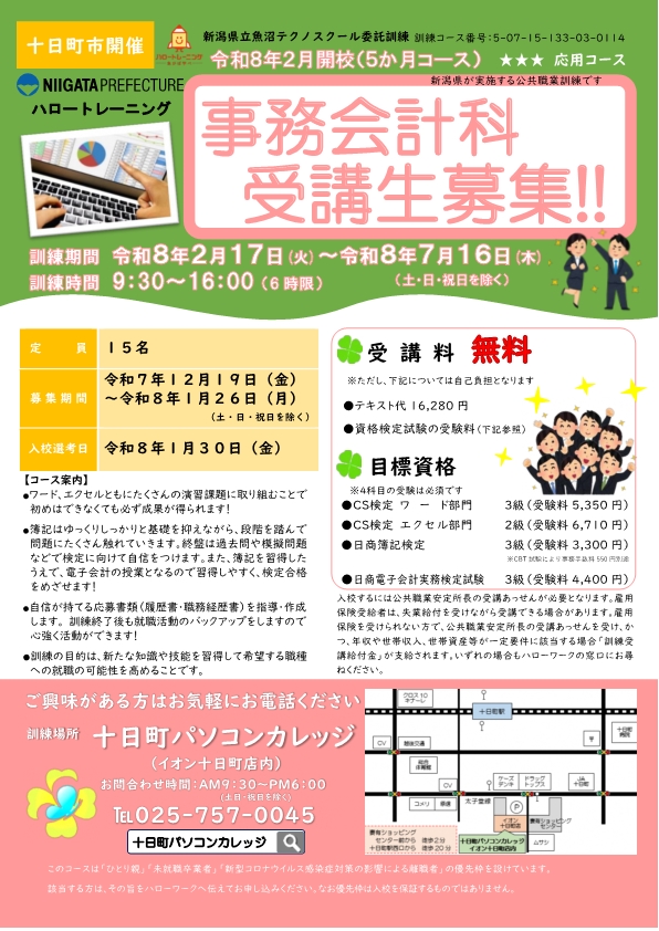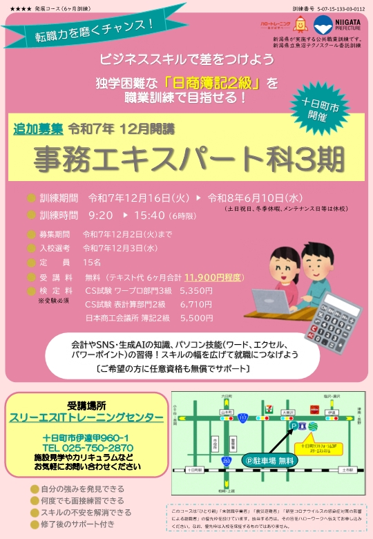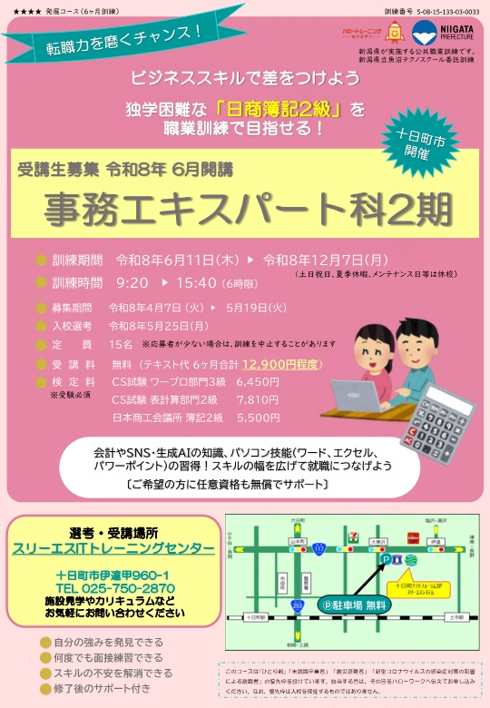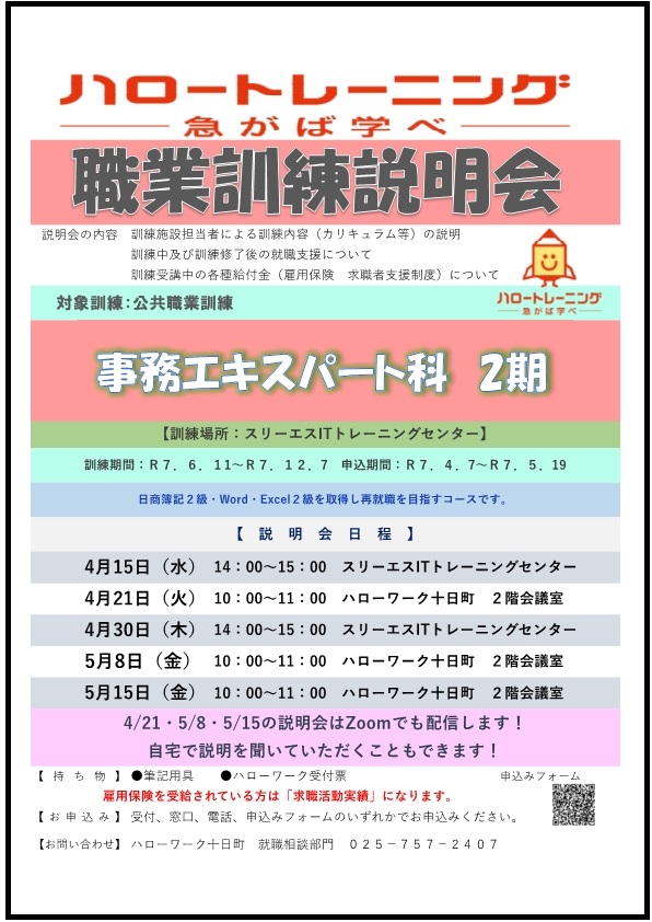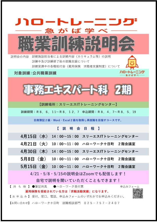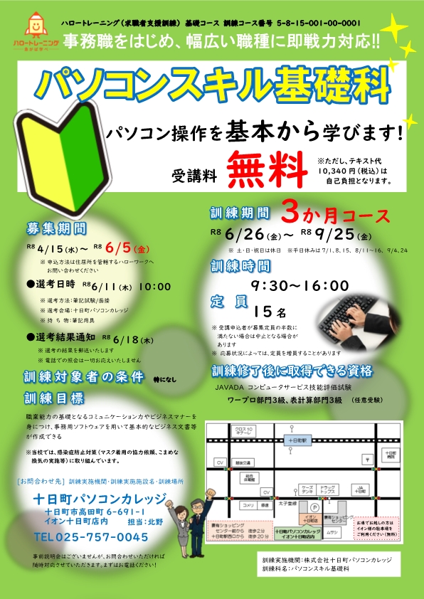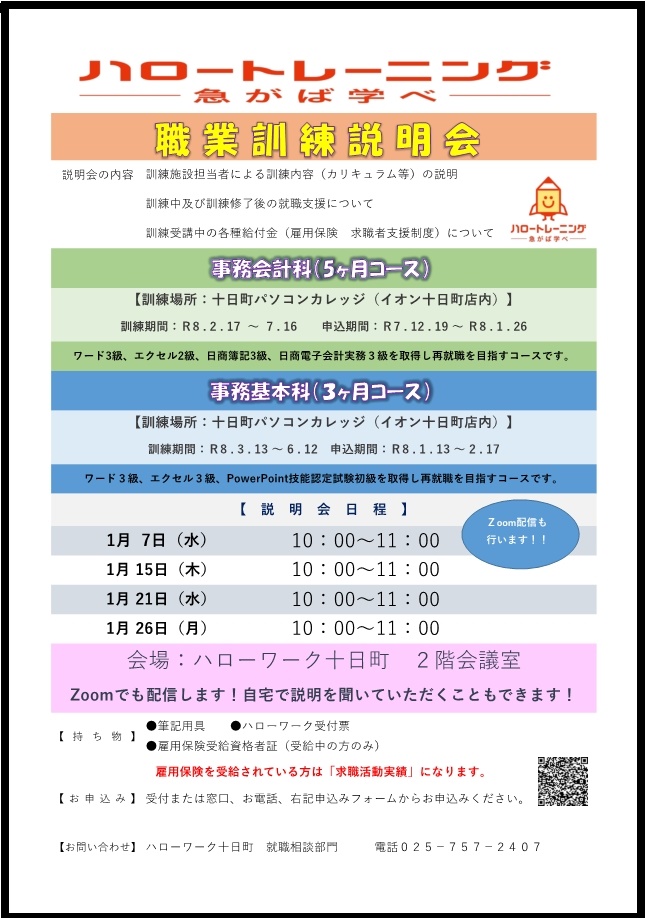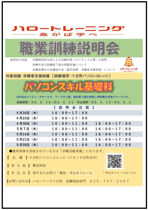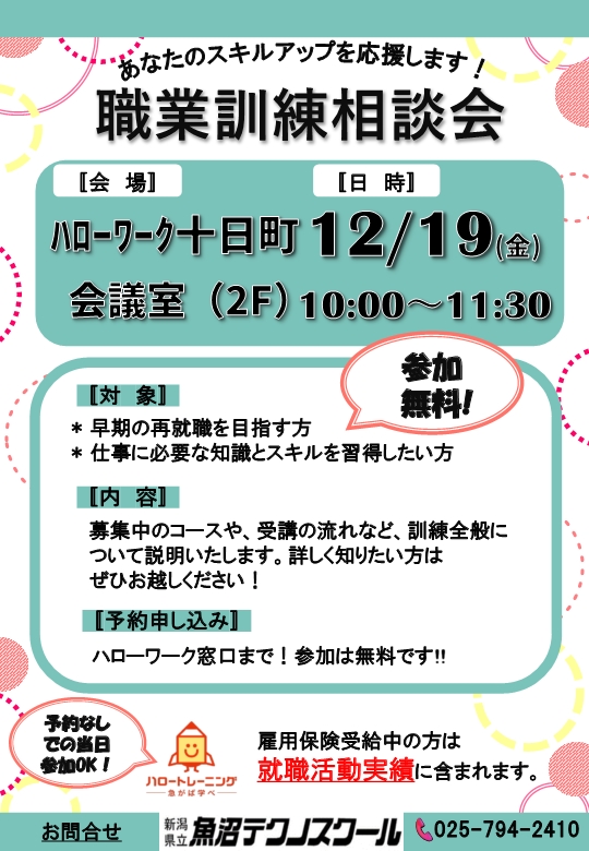 職業訓練制度の概要、新潟県内のコース情報、県内各ハローワークでの訓練説明会開催予定については