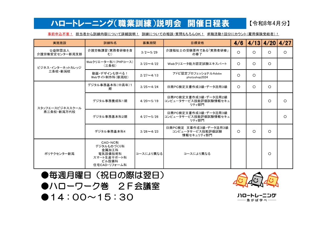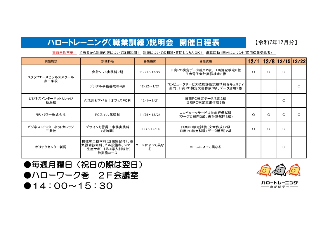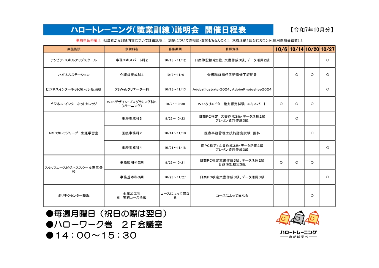 ⇒ハローワーク巻 訓練説明会のご案内をご確認ください。 -