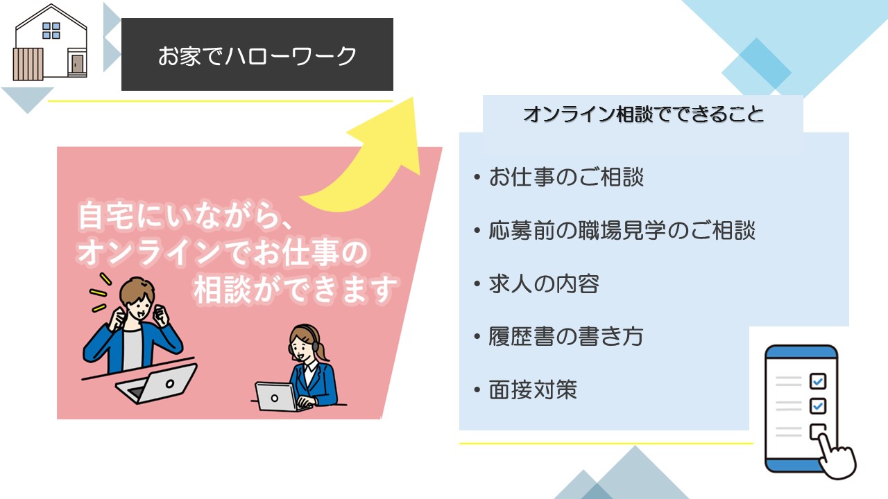 ご自宅にいながらパソコン、スマホによりハローワーク職員と無料でオンライン職業相談ができます。