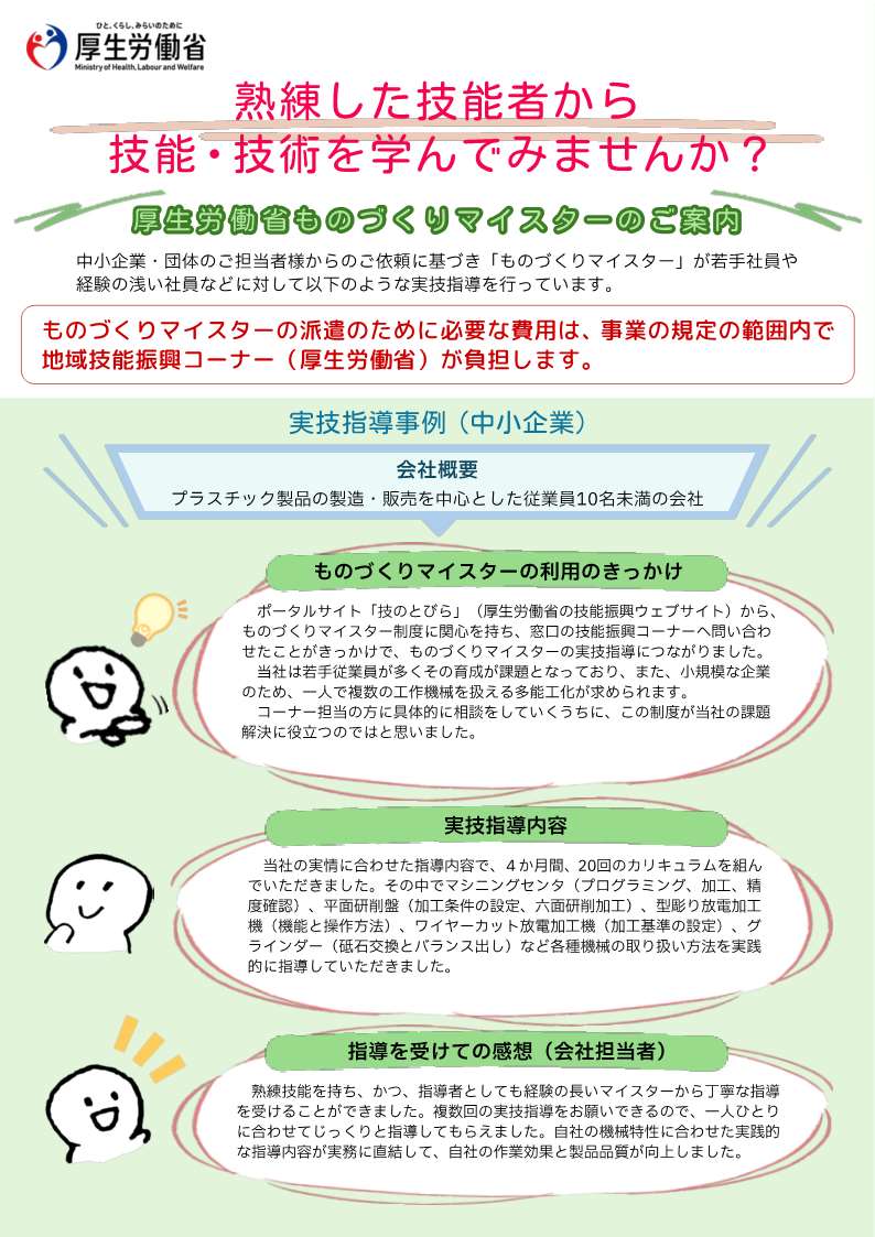 厚生労働省では、産業活動等の基礎となる技能者の育成等を図るため、「ものづくりマイスター」(ものづくり分野等で1級技能士相当以上の指導経験豊富な熟練技能者)を派遣して、中小企業の若年技能者等に対する実技指導などを行っています。