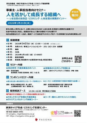 【事業主・人事担当者向けセミナーのご案内】 2026年1月21日(水)に朱鷺メッセ新潟コンベンションセンターにて標記セミナーを開催します。ぜひご参加ください。