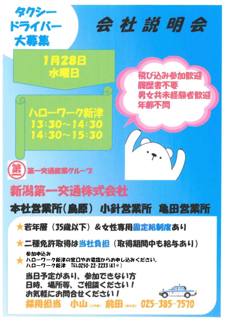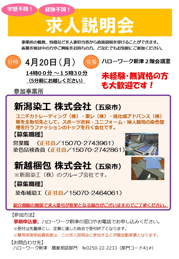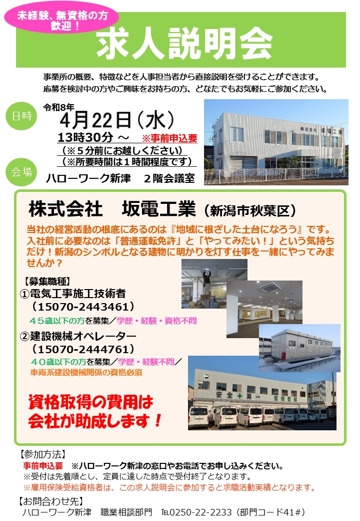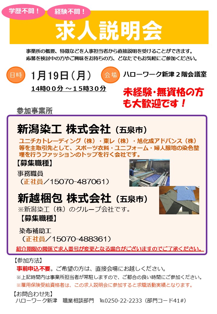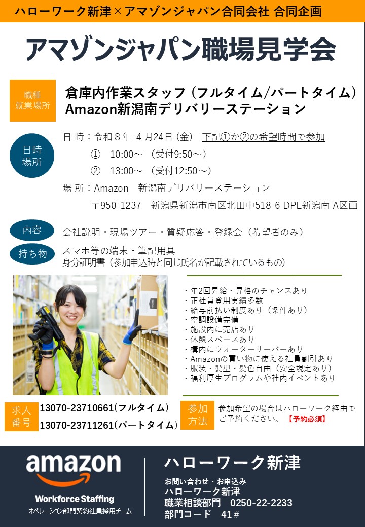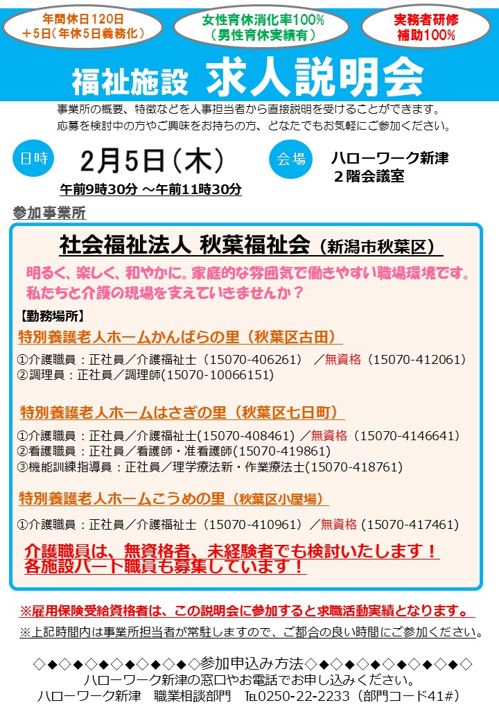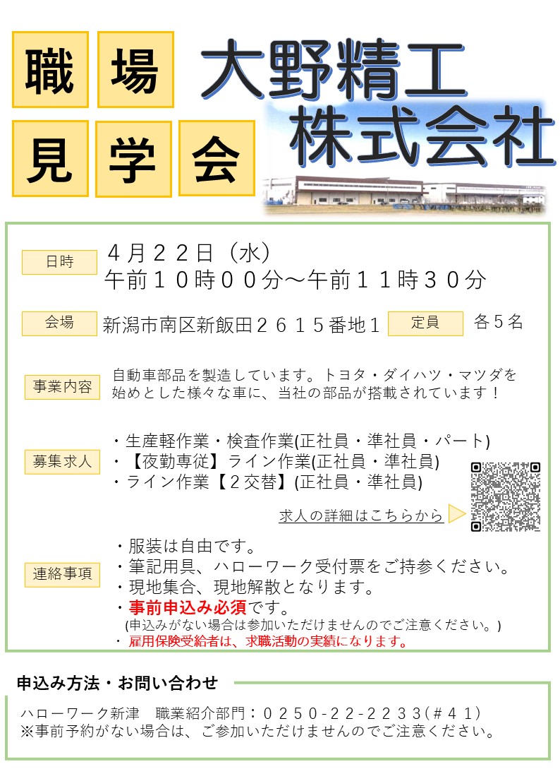 ハローワーク新津では、求人企業の方から、企業の魅力や求人内容等を直接聞くことができる求人説明会。実際に職場に出向き、会社の雰囲気や業務内容についてさらに理解を深めることができる職場見学会を実施しています。