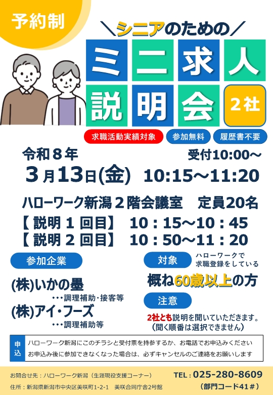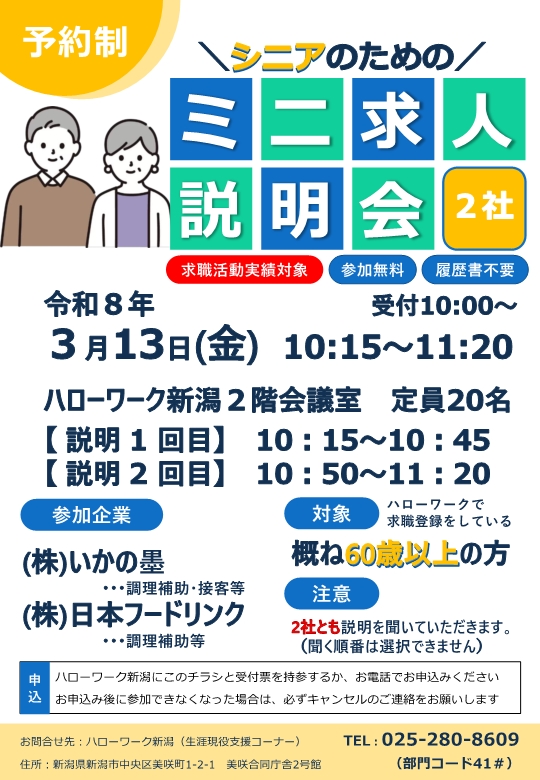 ハローワーク新潟では、概ね60歳以上の方を対象とした「シニアのためのミニ求人説明会」を開催します。