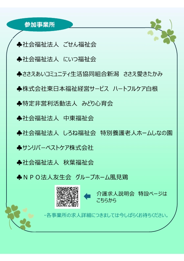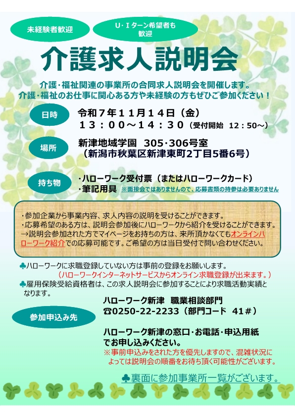 - ・ハローワーク受付票(またはハローワークカード)・筆記用具 ※面接会ではありませんので、応募書類の持参は必要ありません。