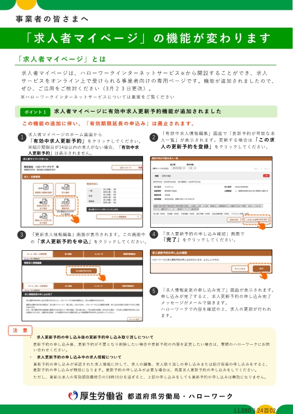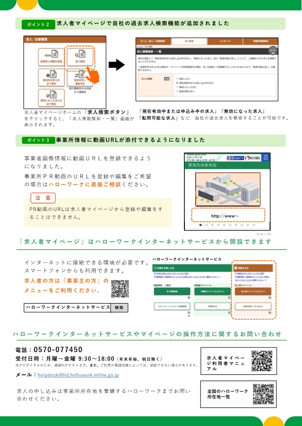 令和8年3月23日にシステムがリニューアルされ、求人票の有効期限を迎える14日前から月末までの間に更新作業を行う「有効中求人更新予約機能」や事業所情報に「PR動画URLが添付(リンク)できる機能」等が追加されました。