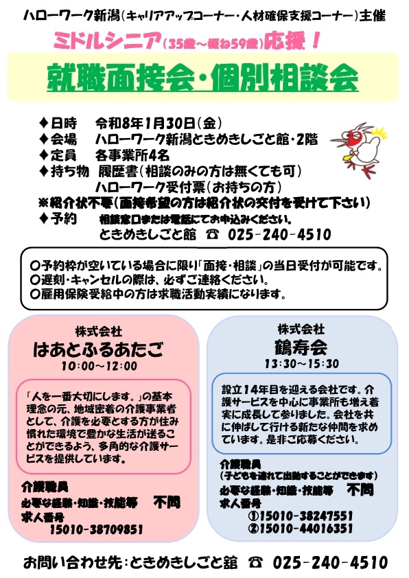 中高年層(ミドルシニア)の就職面接会・個別相談会です。 介護未経験の方も参加可能。面接だけではなく、相談のみの参加も可能です。 〇詳細は、リーフレットまたはHPをご確認ください。