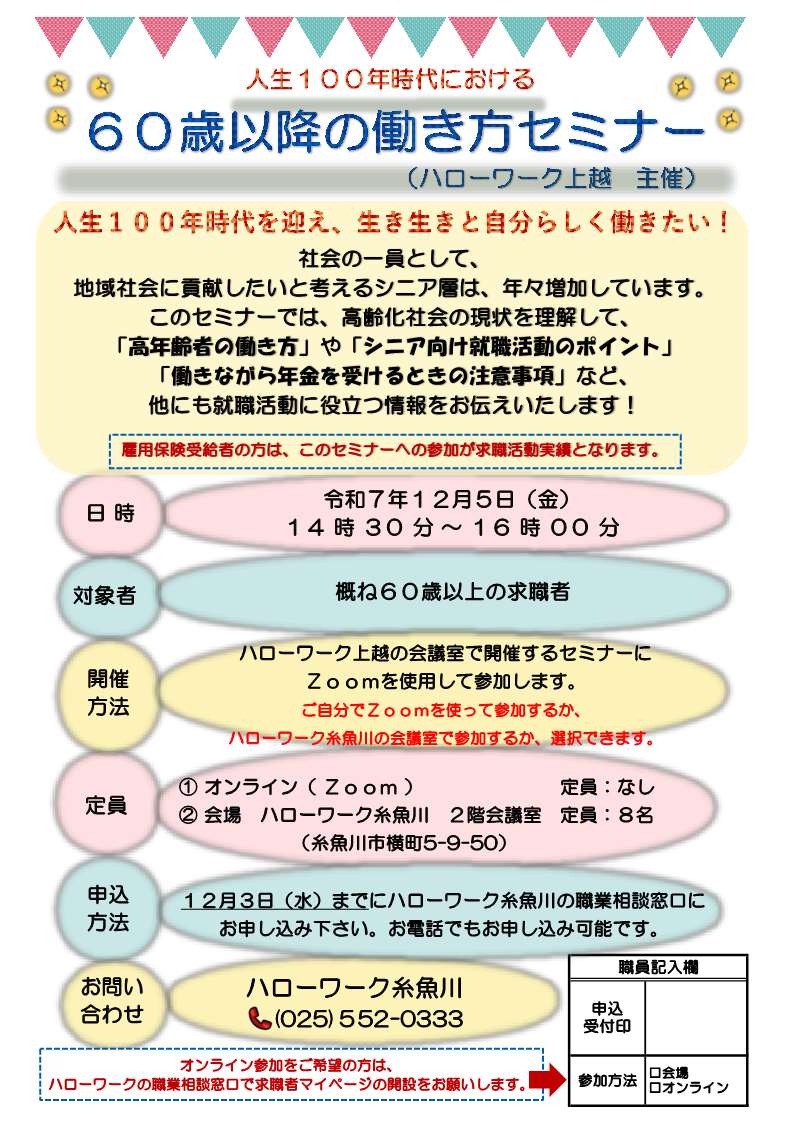 - 12月3日(水)までにハローワーク糸魚川の職業相談窓口にお申し込みください。お電話でも、お申し込み可能です。