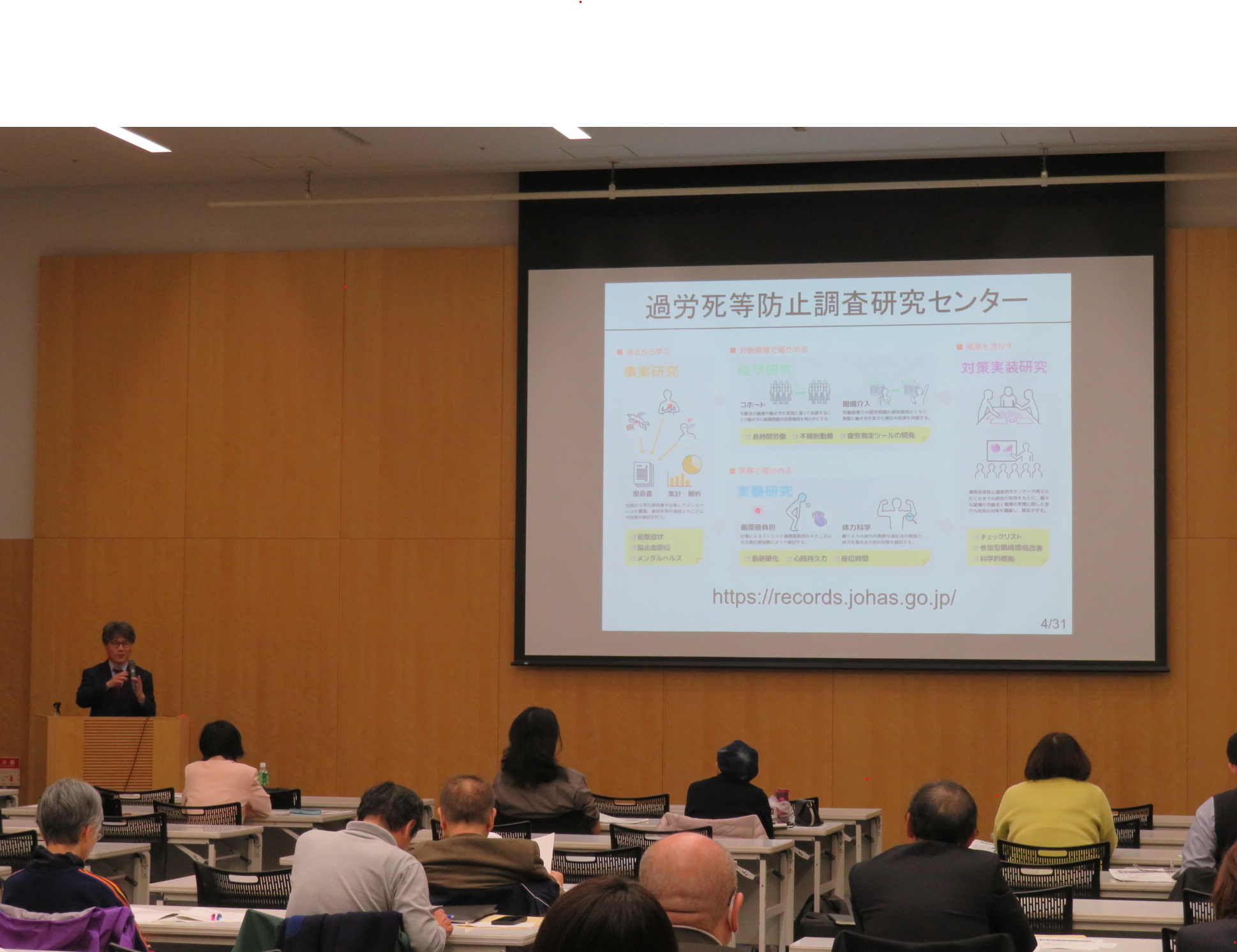 独立行政法人労働者健康安全機構 労働安全衛生総合研究所の高橋正也氏から「生産性を高め、過労死等を防ぐために欠かせない睡眠」と題して基調講演をしていただいたほか、過労死を考える家族の会からの体験談の発表や労働組合による労働現場からの報告などが行われました。