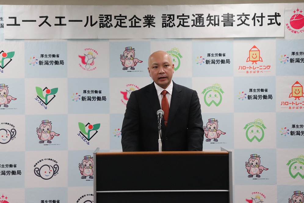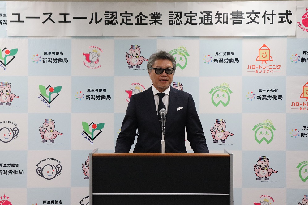 この度はユースエール認定を賜りまして、大変ありがとうございます。非常に身に余る思いと身の引き締まる思いと、両方ある中で今日を迎えております。