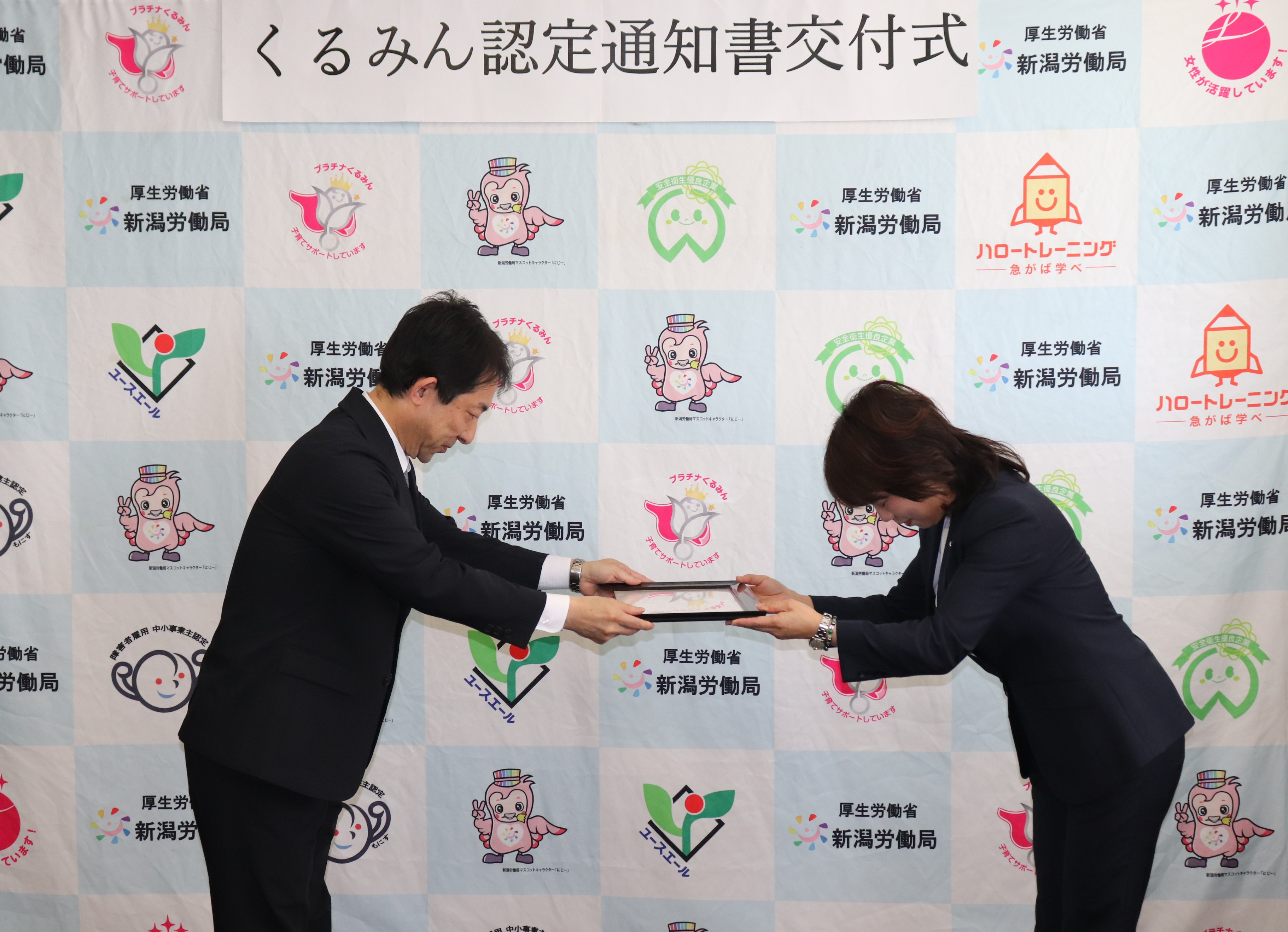 | 左から 新潟労働局 黒部局長 新潟縣信用組合 人事部部長 高橋 雅美 様 新潟縣信用組合 人事部 小山 茉緒 様 |