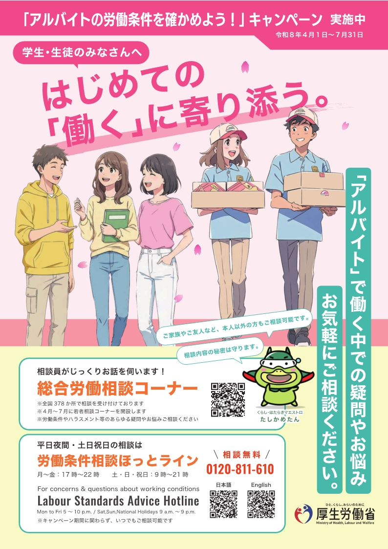 ▶ 令和8年度「アルバイトの労働条件を確かめよう!」キャンペーンを全国で実施します(厚生労働省HP)