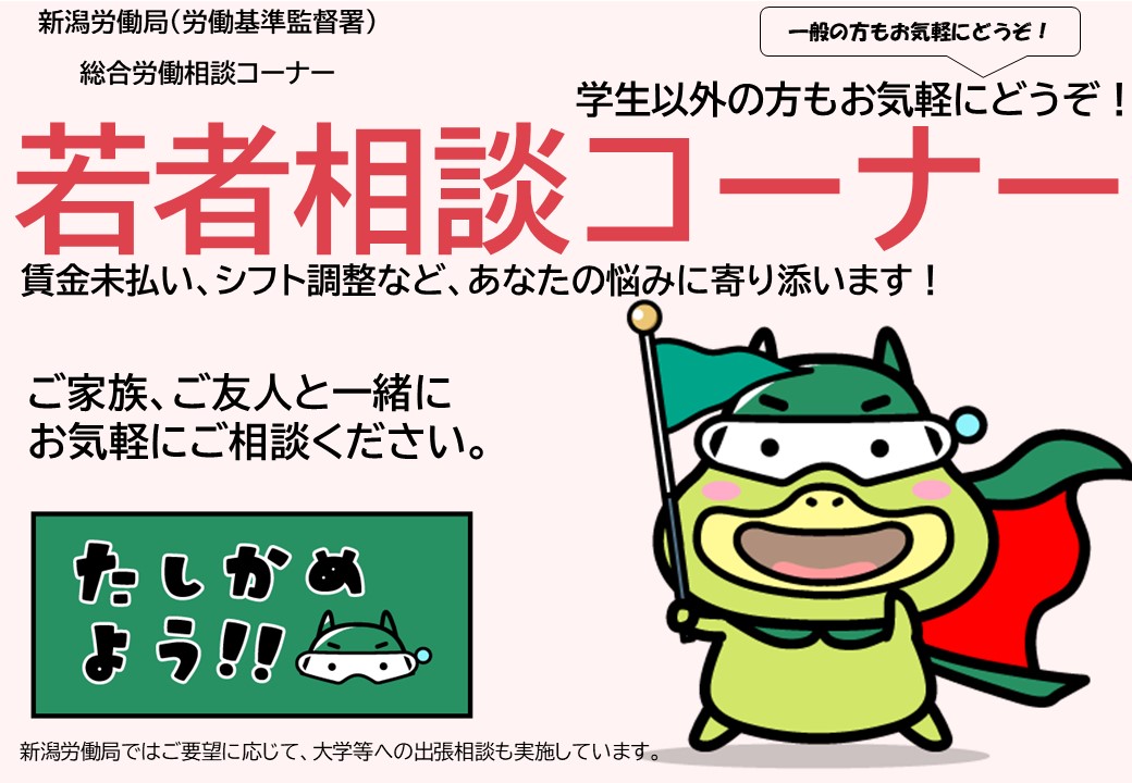 新潟労働局及び各労働基準監督署の総合労働相談コーナーにおいては「若者相談コーナー」を設け、アルバイトの皆様からの労働条件に関する相談を受け付けております。働くことについての事柄で気になる事や知りたいことがある方は職員・相談員共にお待ちしておりますのでお近くの総合労働相談コーナーにご相談下さい。