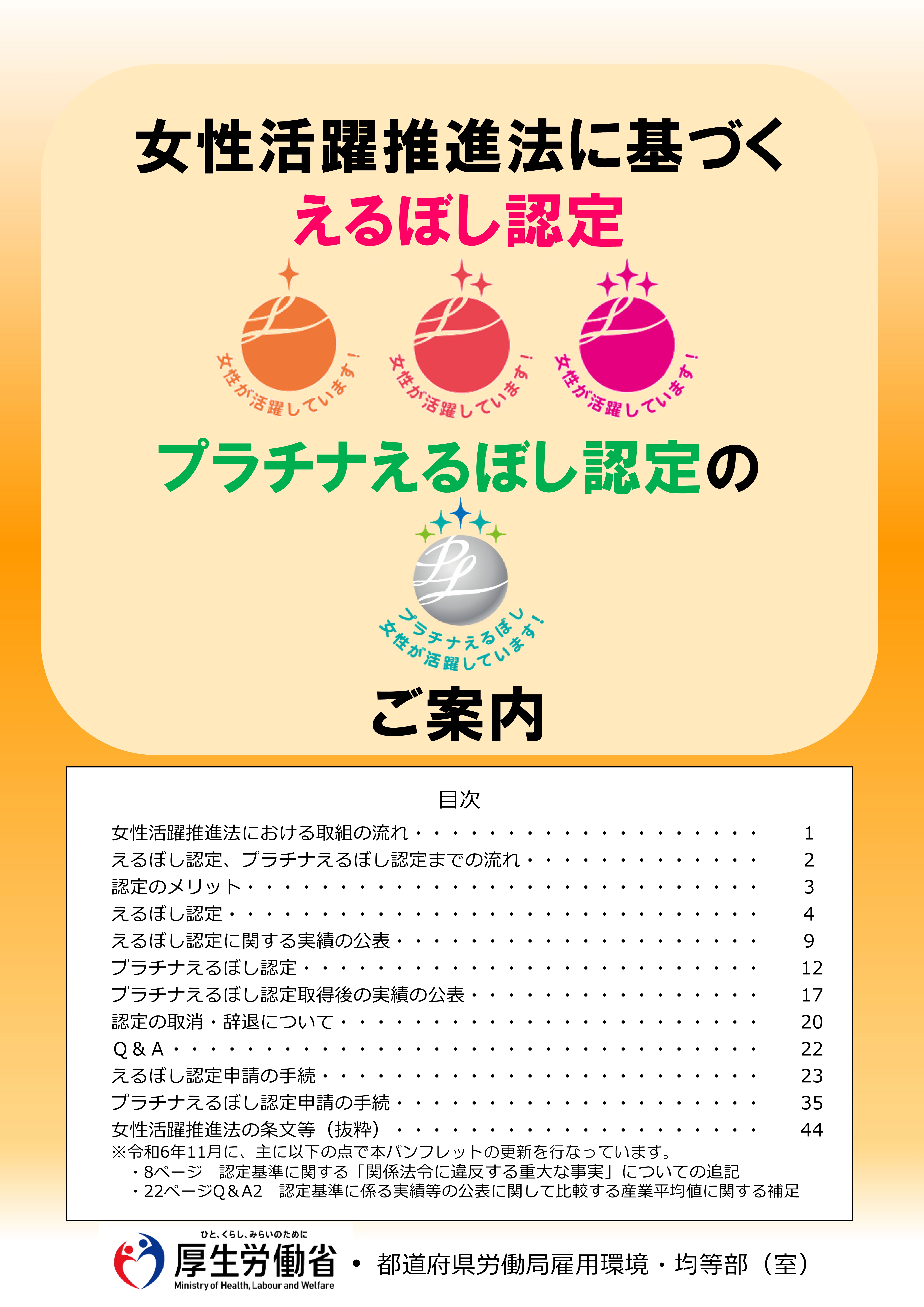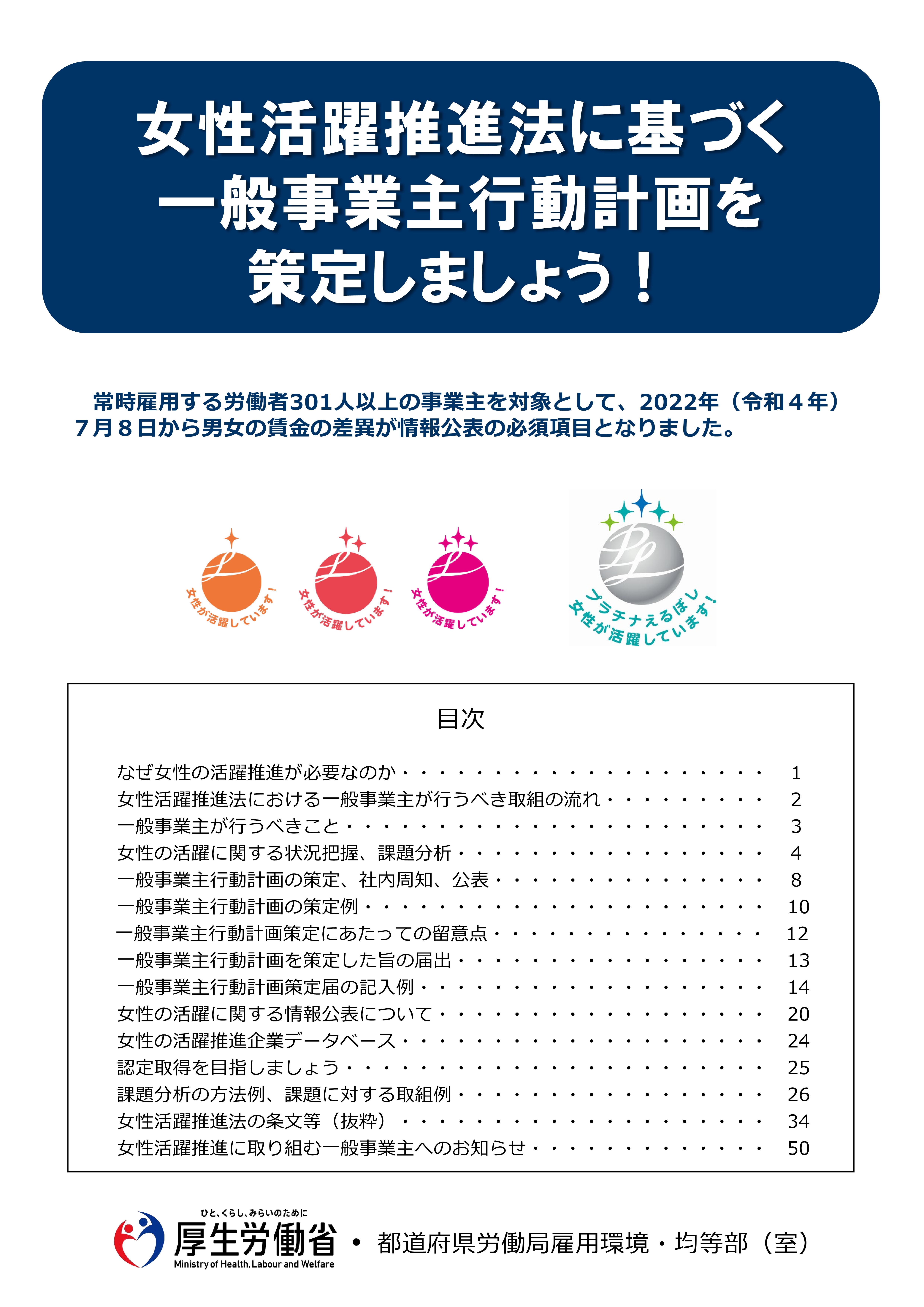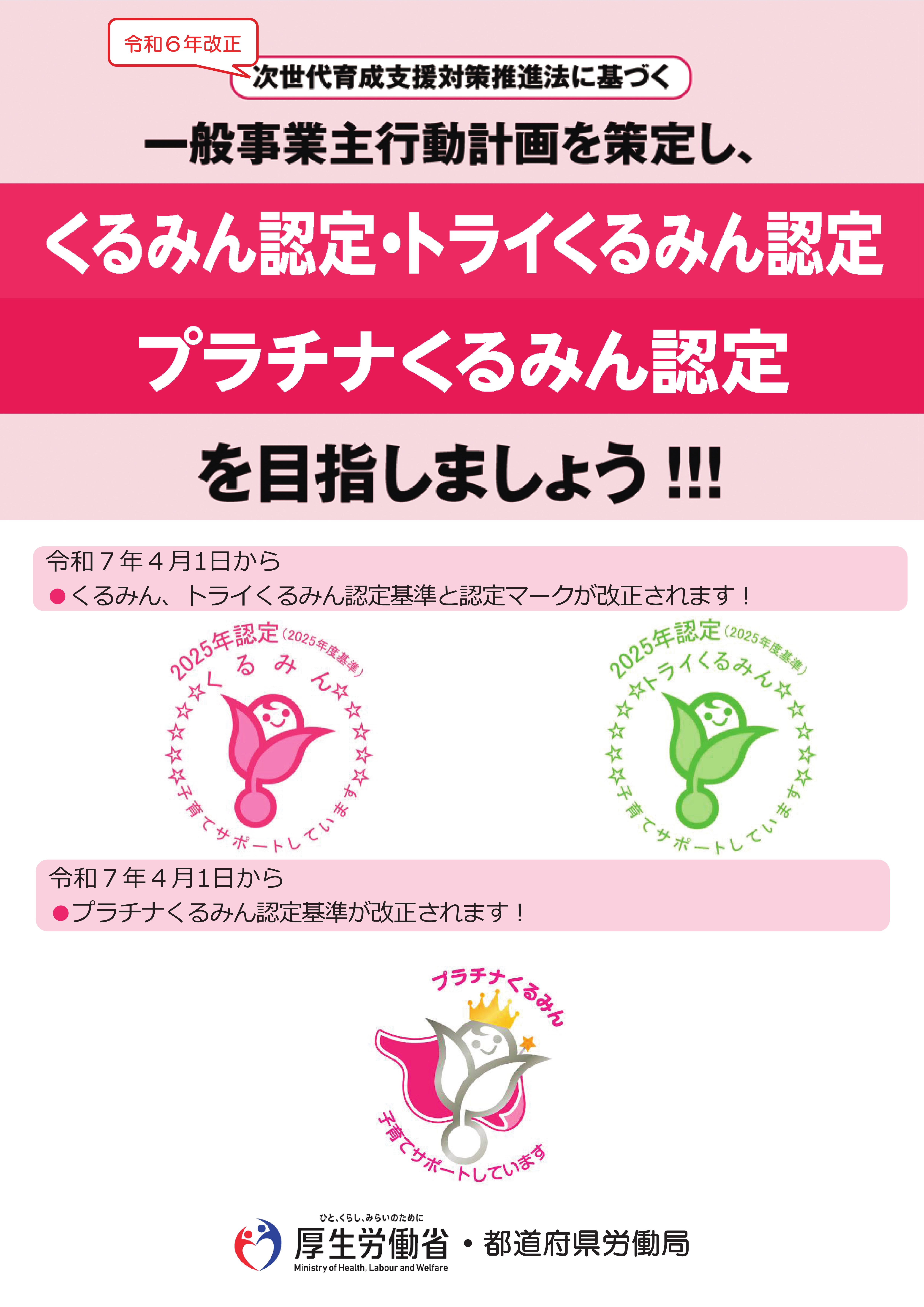 | 一般事業主行動計画の策定 | 育児・介護休業法のあらまし | 次世代対策推進法・くるみん認定 | 女性活躍推進法・えるぼし認定 | パートタイム・有期雇用労働法のあらまし |