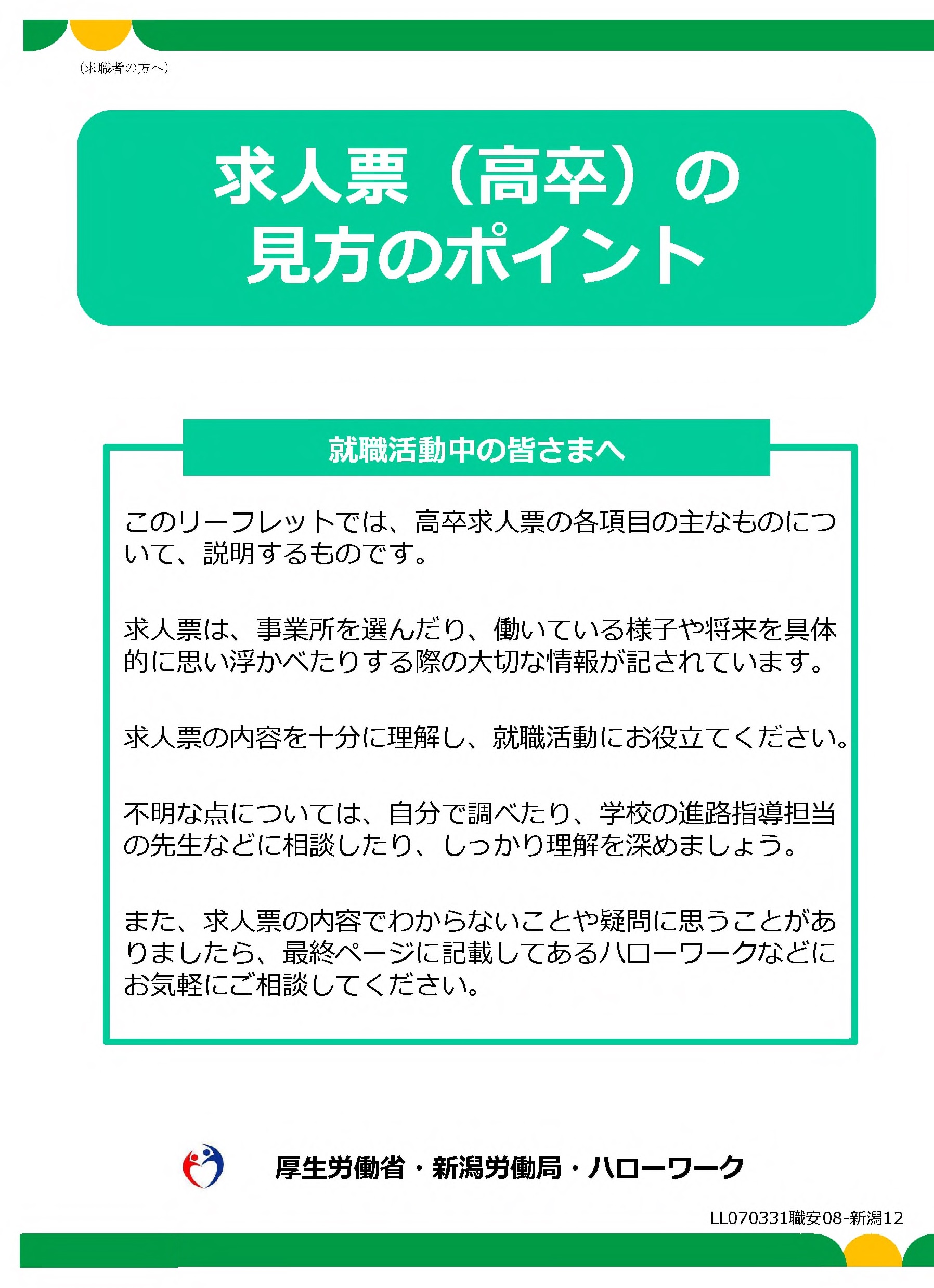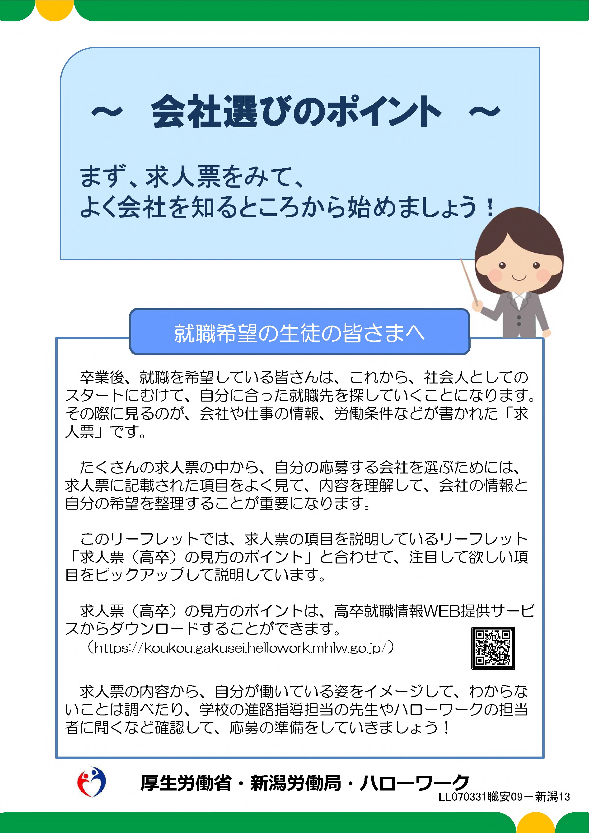| 求人票(高卒)の見方のポイント | 求人票(高卒)の書き方のポイント | 会社選びのポイント (就職希望の生徒の皆さまへ) |