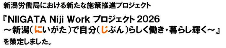 | 新潟労働局は、このプロジェクトの推進により、新潟で働く誰もが、「新潟で自分らしく働き、暮らし、輝く」ことのできる社会の実現を目指し取り組むとともに、労働局の取組等を分かりやすく情報発信していきます。 ●NIIGATA Niji Work プロジェクト2026 1. ダイジェスト版 2. 令和8年度 新潟労働局行政運営方針 ●NIIGATA Niji Work プロジェクト2025 1. ダイジェスト版 2. 進捗状況(2026年3月末現在)