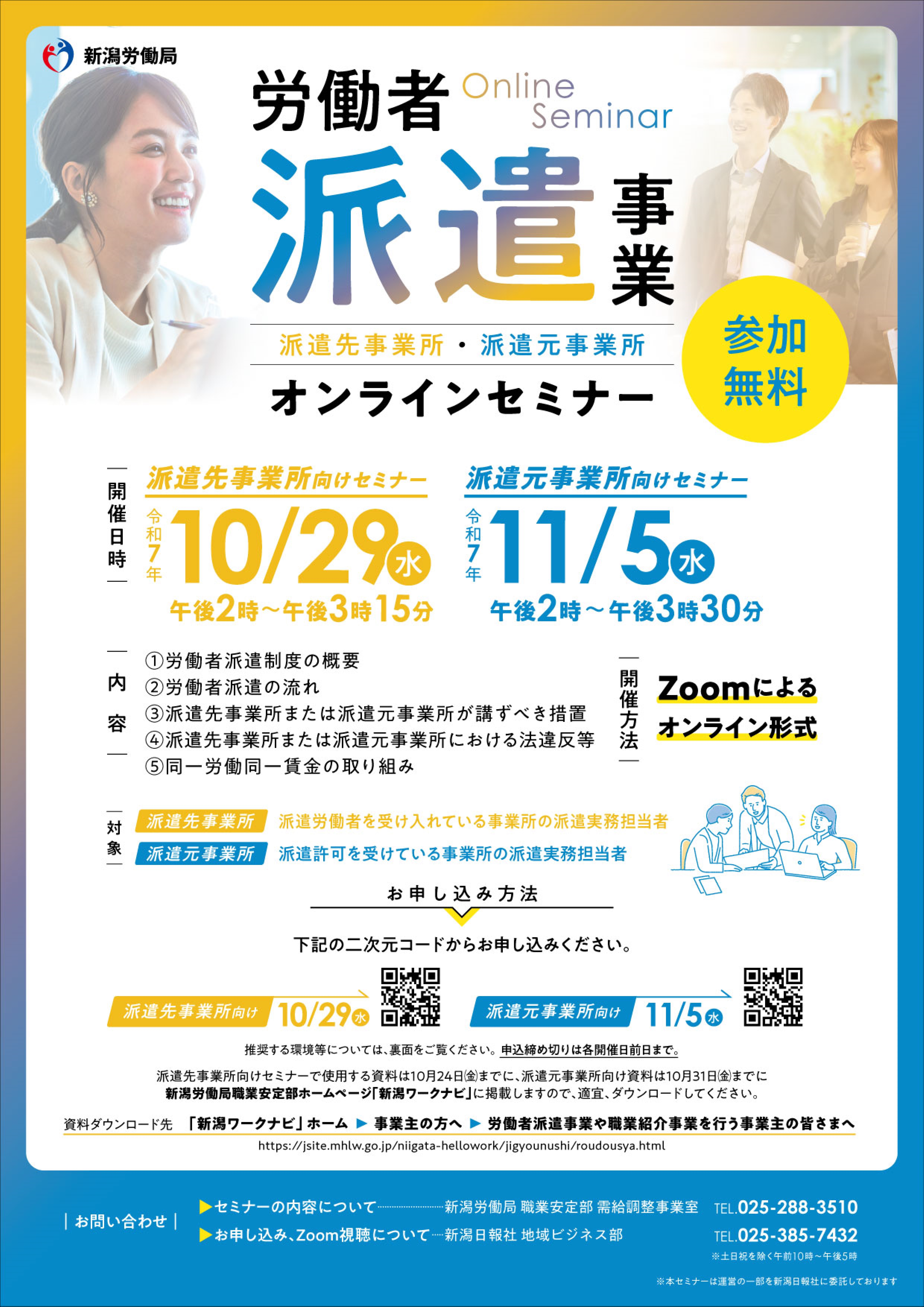 【派遣先事業所向けセミナー】 開催日時:令和7年10月29日(水) 午後2時~午後3時15分 対 象:派遣労働者を受け入れている事業所の 派遣実務担当者 |