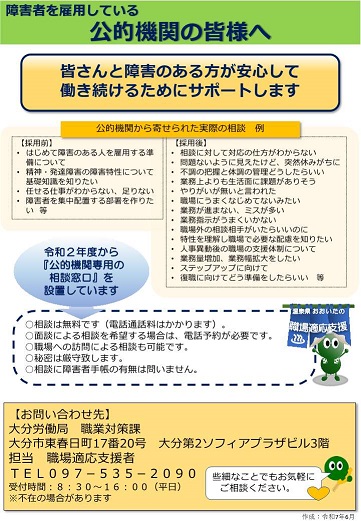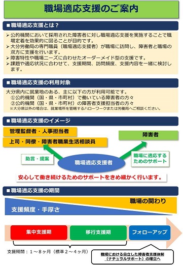 ・公的機関において採用された障害者に対し職場適応支援を実施することで職場定着を効果的に図ることが目的です。