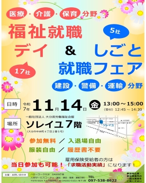 令和7年11月14日(金)13:00~15:00に「福祉就職デイ~2025年度 福祉のしごと就職フェア~ & 2025年度 建設・警備・運輸分野しごと就職フェア」を開催します!