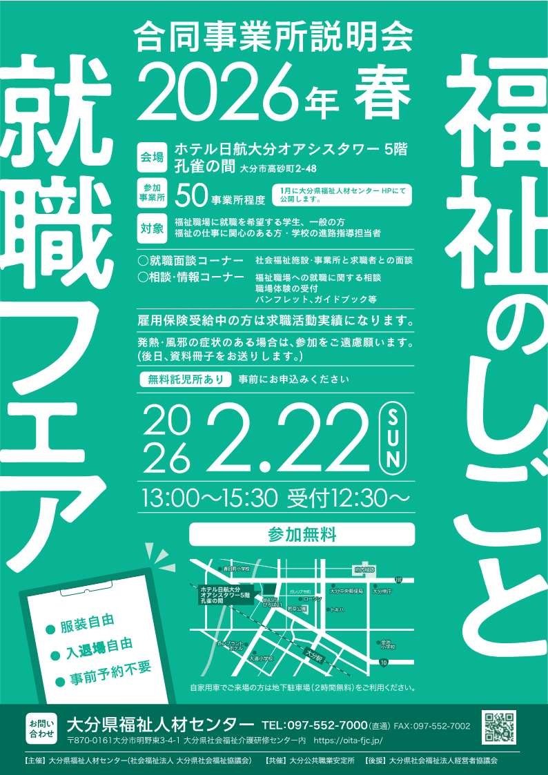 福祉関連の職場に就職を希望される方または関心のある方を対象に、「2026年春 福祉のしごと就職フェア」を下記のとおり開催します(主催:大分県福祉人材センター/共催:大分公共職業安定所)。
