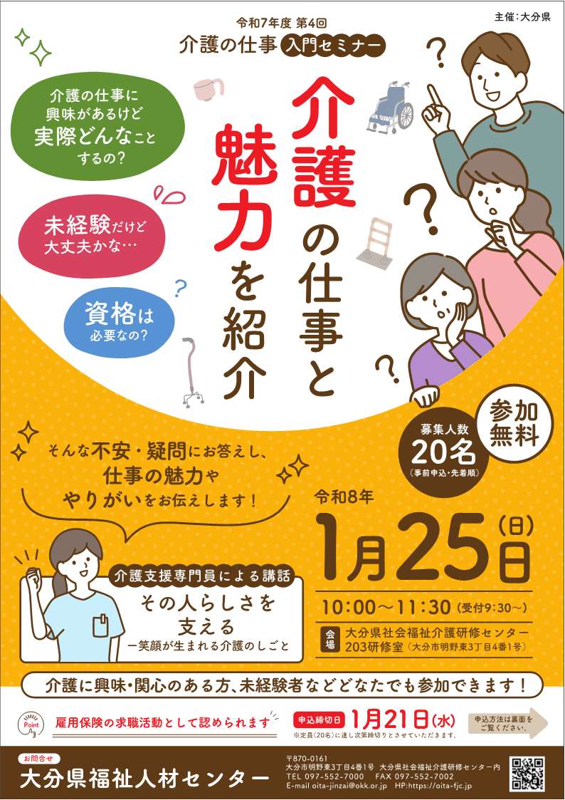 介護に興味・関心のある方、介護の仕事に就きたいと考えている方など、就労や学びへの動機づくりのセミナーを下記のとおり開催します(主催:大分県)。