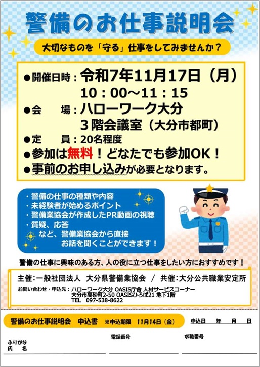 警備の仕事に興味のある方、警備員として就職を希望される方を対象に、警備のお仕事説明会を下記のとおり開催します(主催:大分県警備業協会、共催:大分公共職業安定所)。