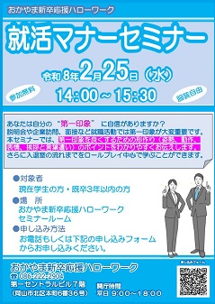 おかやま新卒応援ハローワークに登録されている方 (予定も可) なら誰でもご参加いただけます。