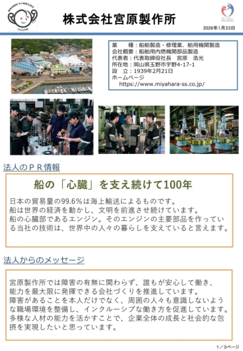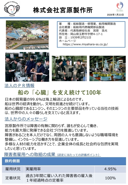 株式会社宮原製作所は、創業100年の歴史があり、「明日へ進む力を、これからも。」をスローガンに、高い技術力と品質により、大型船舶用ディーゼルエンジンの機関部品メーカーとして機械加工から組立てまで一貫生産を行っています。