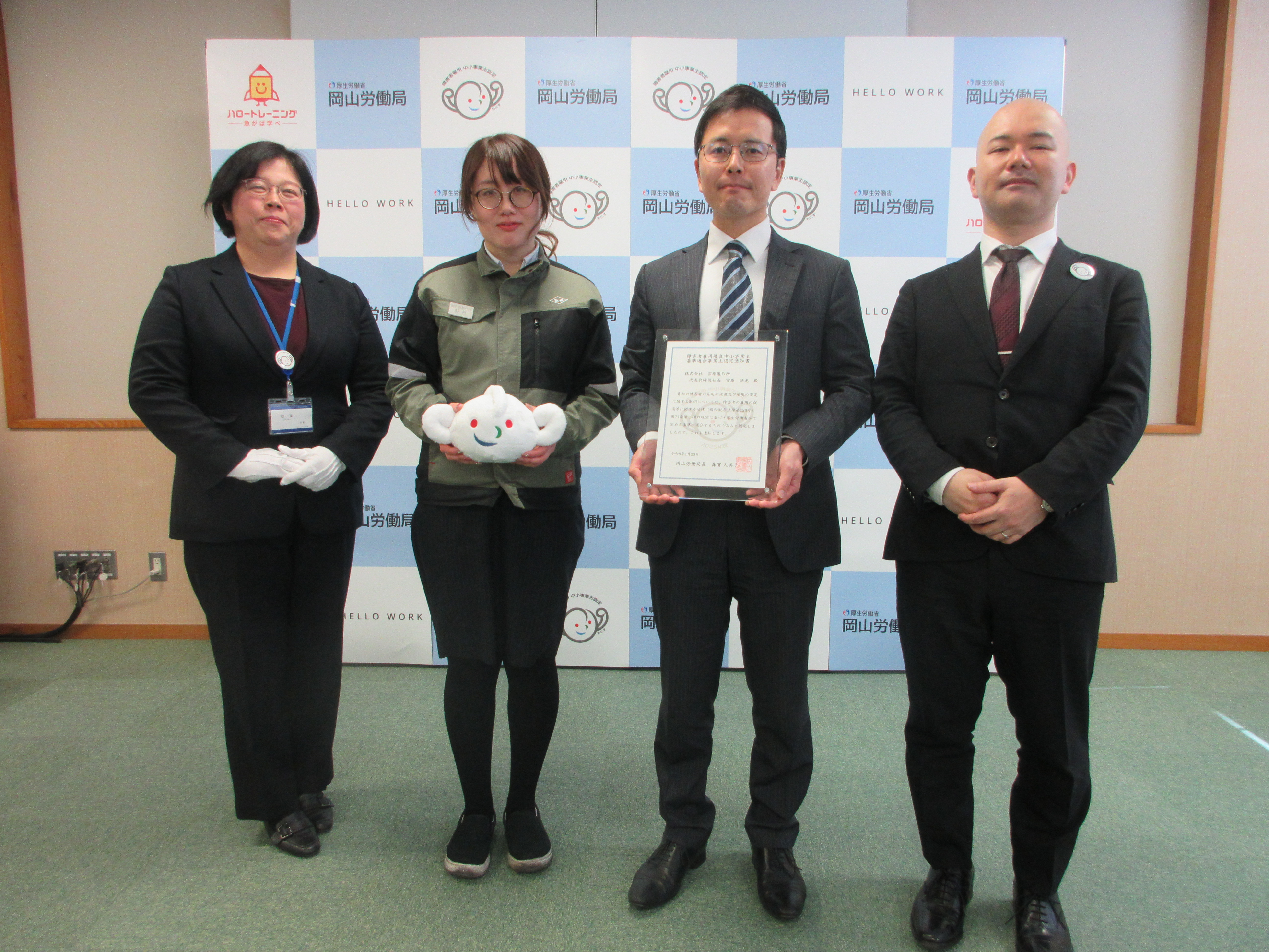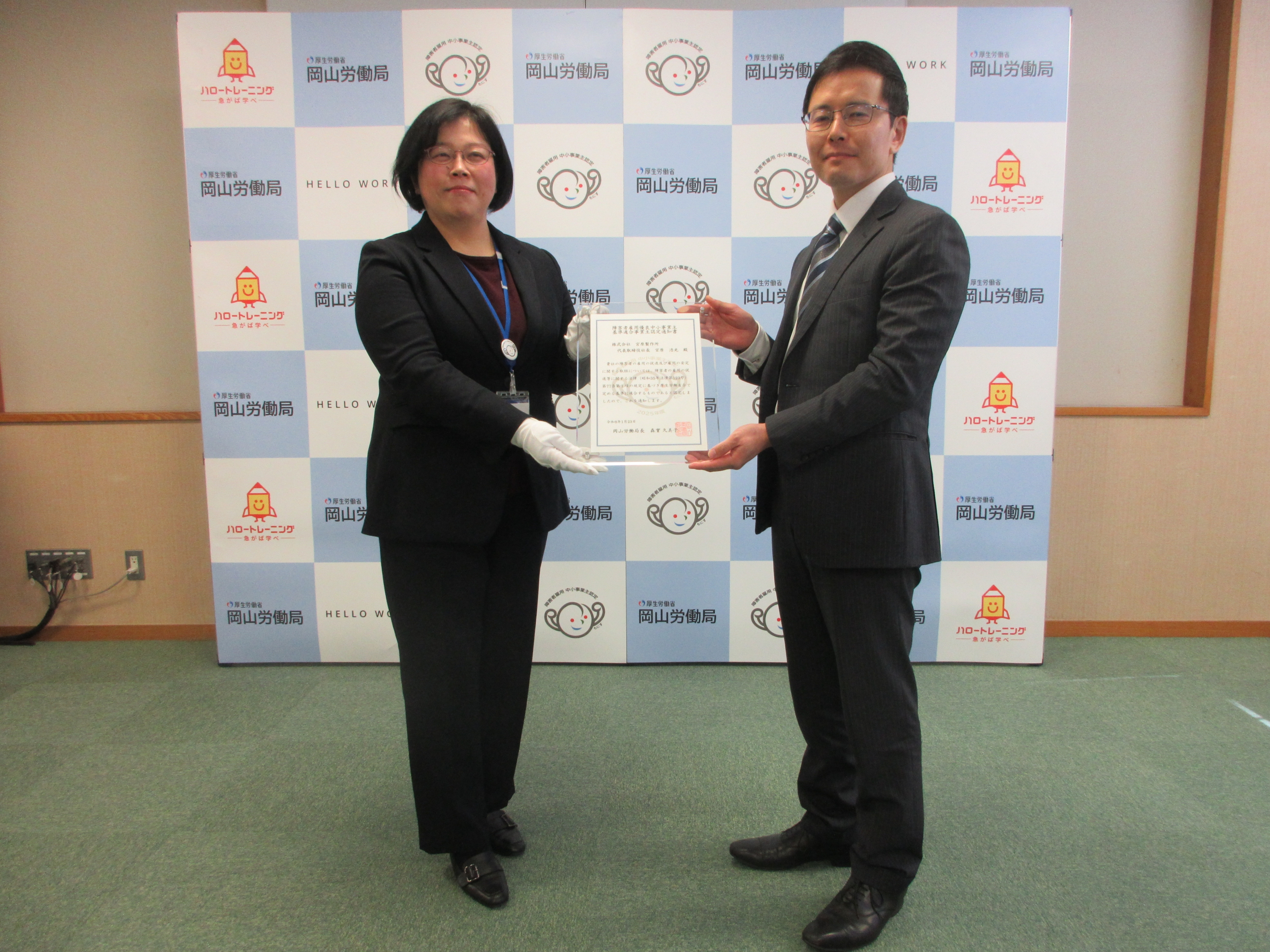 令和8年2月9日(月)、玉野公共職業安定所において同所 奥廣 古都 所長(左)から株式会社宮原製作所 代表取締役社長 宮原 浩光 氏(右)に、もにす認定通知書をお渡ししました。